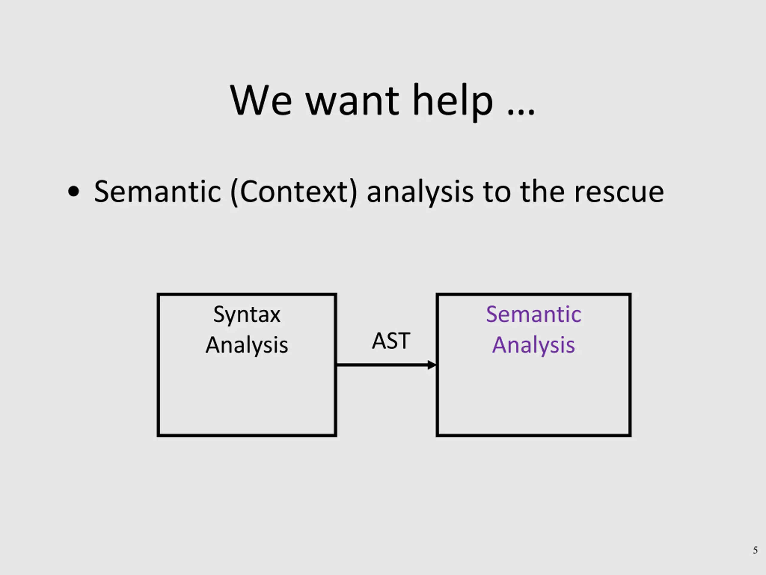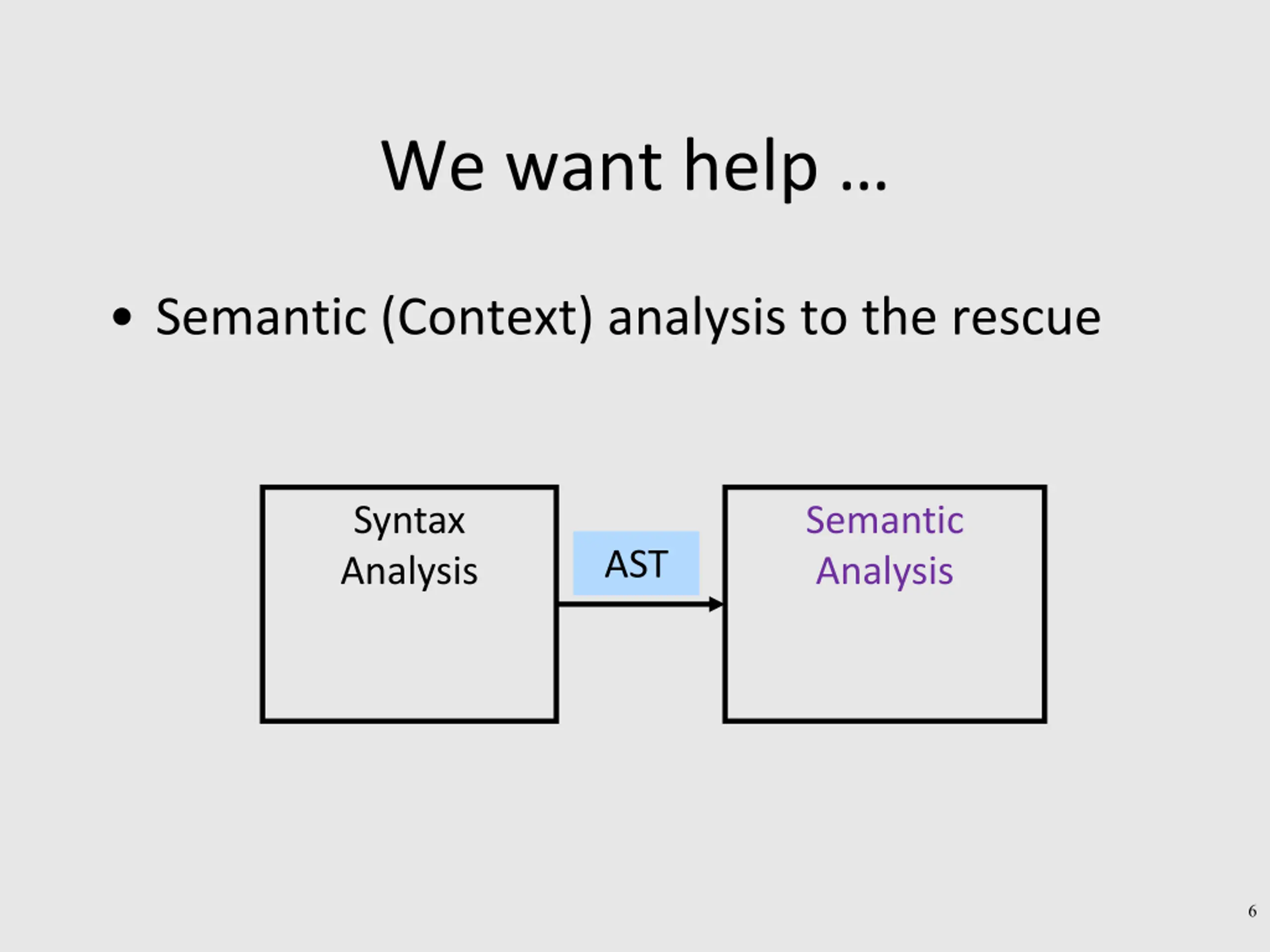 We want help Semantic (Context) analysis to the rescue Syntax Analysis Semantic Analysis AST 5