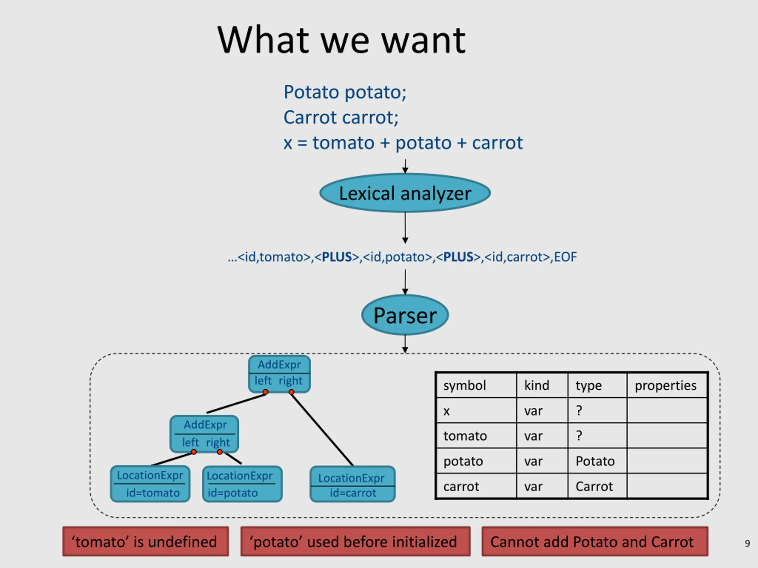 What we want Potato potato; Carrot carrot; x = tomato + potato + carrot Lexical analyzer <id,tomato>,<PLUS>,<id,potato>,<PLUS>,<id,carrot>,EOF Parser AddExpr left right symbol kind type properties x var ? AddExpr left right tomato var ? potato var Potato LocationExpr id=tomato LocationExpr id=potato LocationExpr carrot var Carrot id=carrot tomato is undefined potato used before initialized Cannot add Potato and Carrot 9
