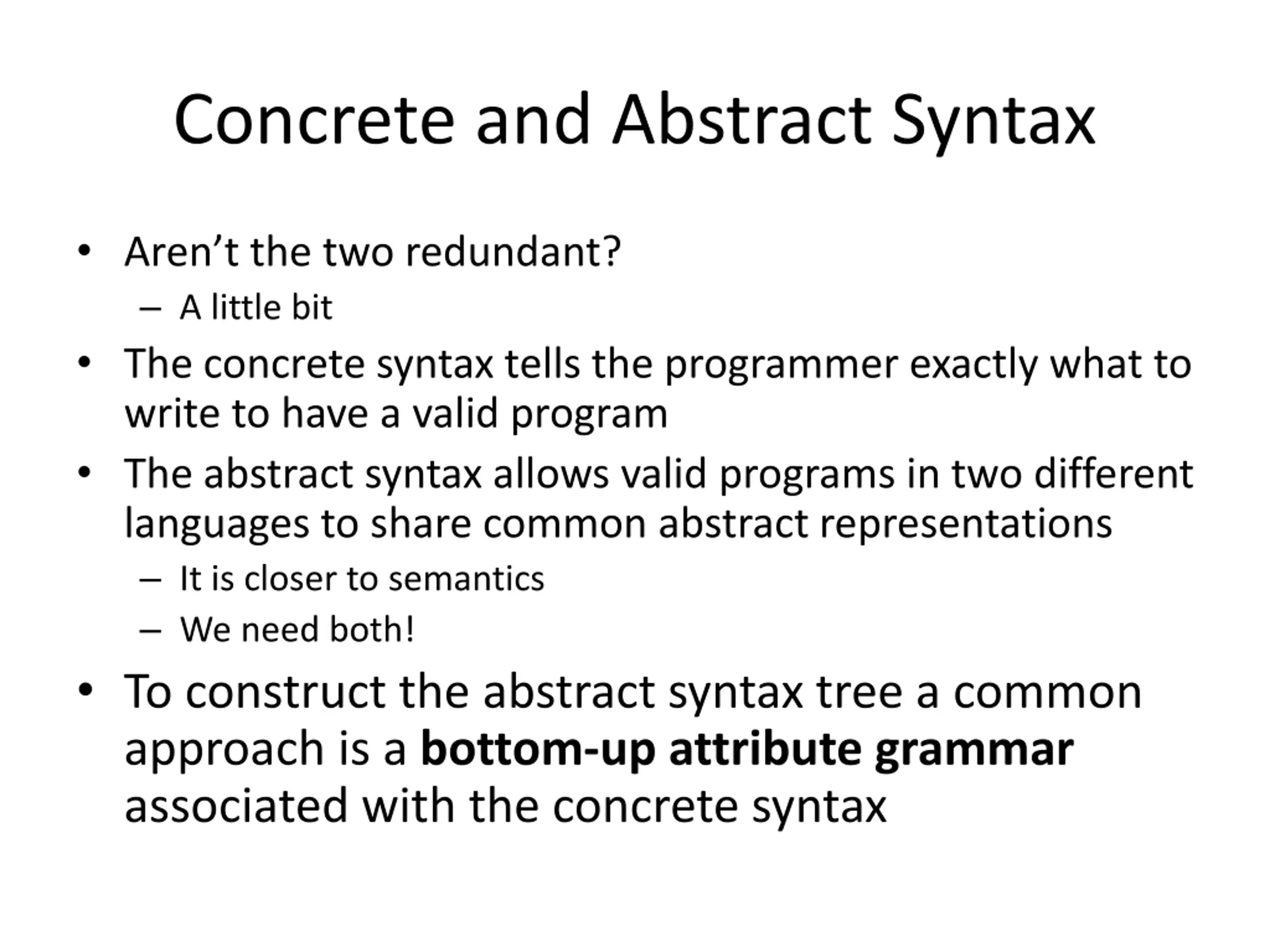 Concrete and Abstract Syntax Aren t the two redundant? A little bit The concrete syntax tells the programmer exactly what to write to have a valid program The abstract syntax allows valid programs in two different languages to share common abstract representations It is closer to semantics We need both! To construct the abstract syntax tree a common approach is a bottom-up attribute grammar associated with the concrete syntax