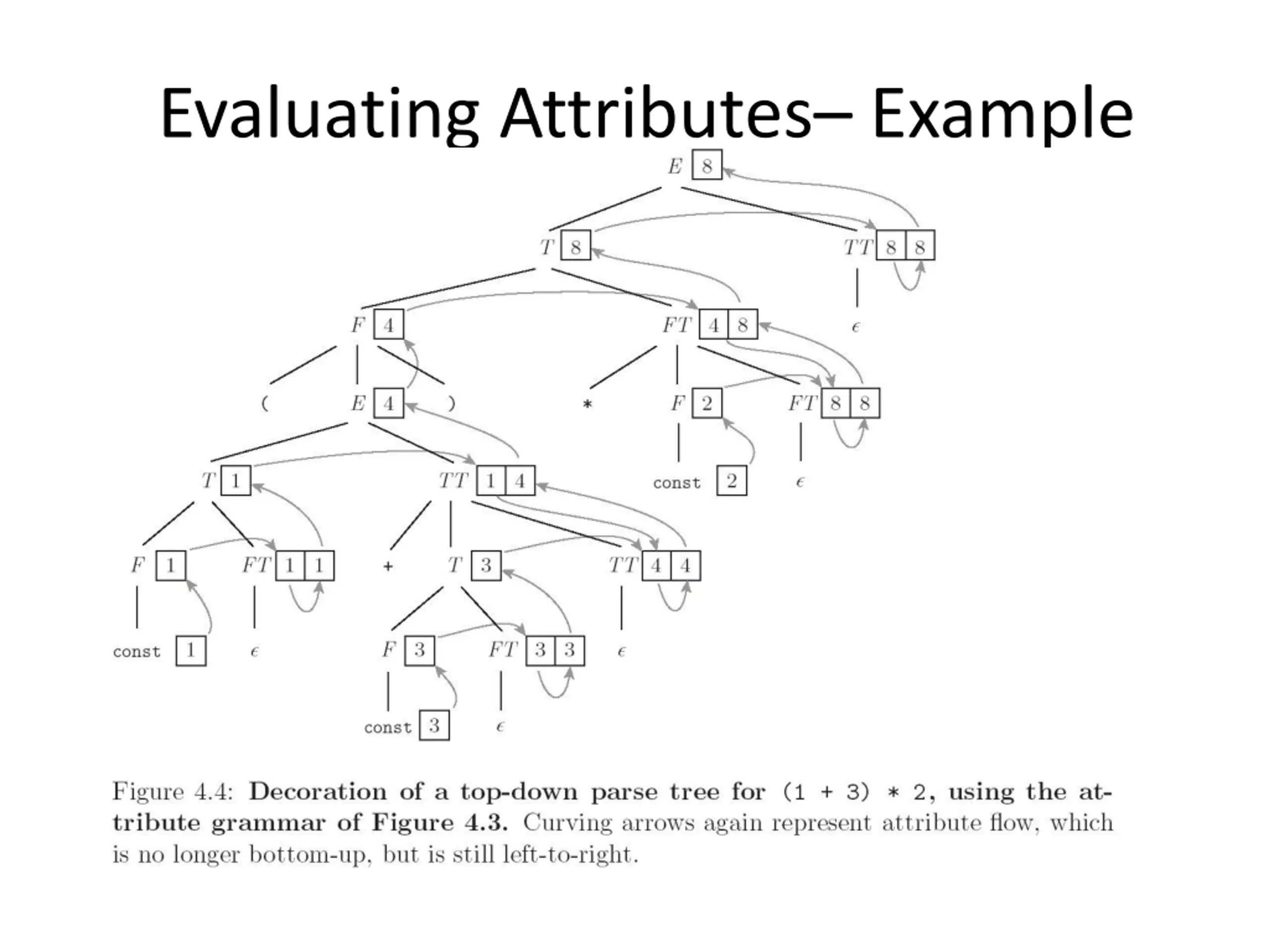 Evaluating Attributes Example Attribute grammar in Figure 4.3: E T TT TT1 + T TT2 TT1 - T TT2 TT T F FT E.v = TT.v TT.st = T.v TT1.v = TT2.v TT2.st = TT1.st + T.v TT1.v = TT2.v TT2.st = TT1.st - T.v TT.v = TT.st T.v = FT.v FT.st = F.v