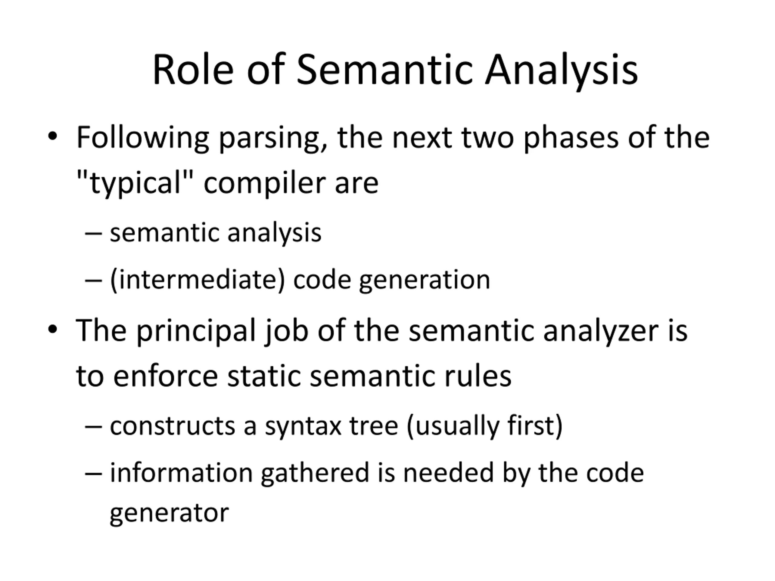 Role of Semantic Analysis Following parsing, the next two phases of the "typical" compiler are semantic analysis (intermediate) code generation The principal job of the semantic analyzer is to enforce static semantic rules constructs a syntax tree (usually first) information gathered is needed by the code generator