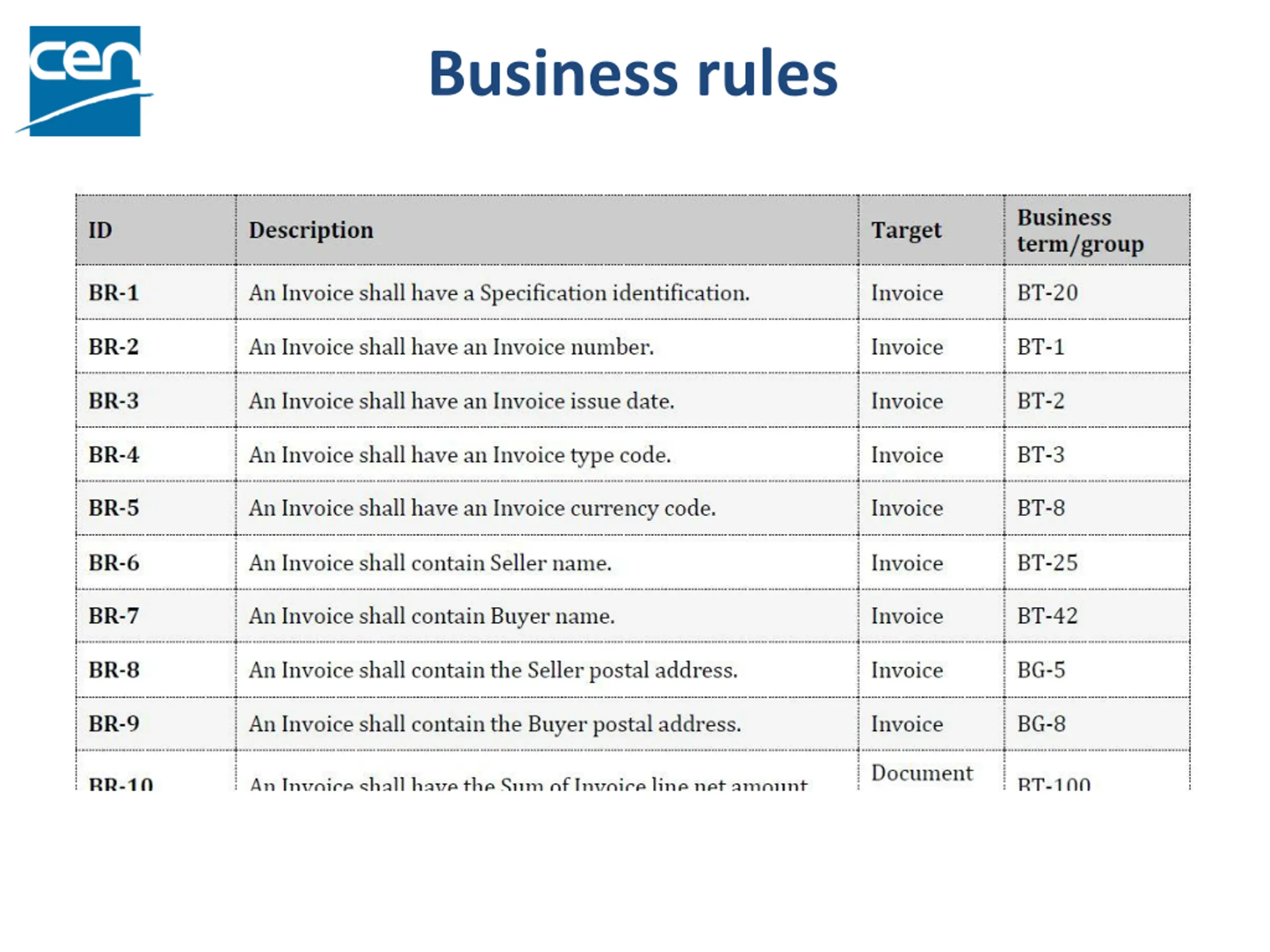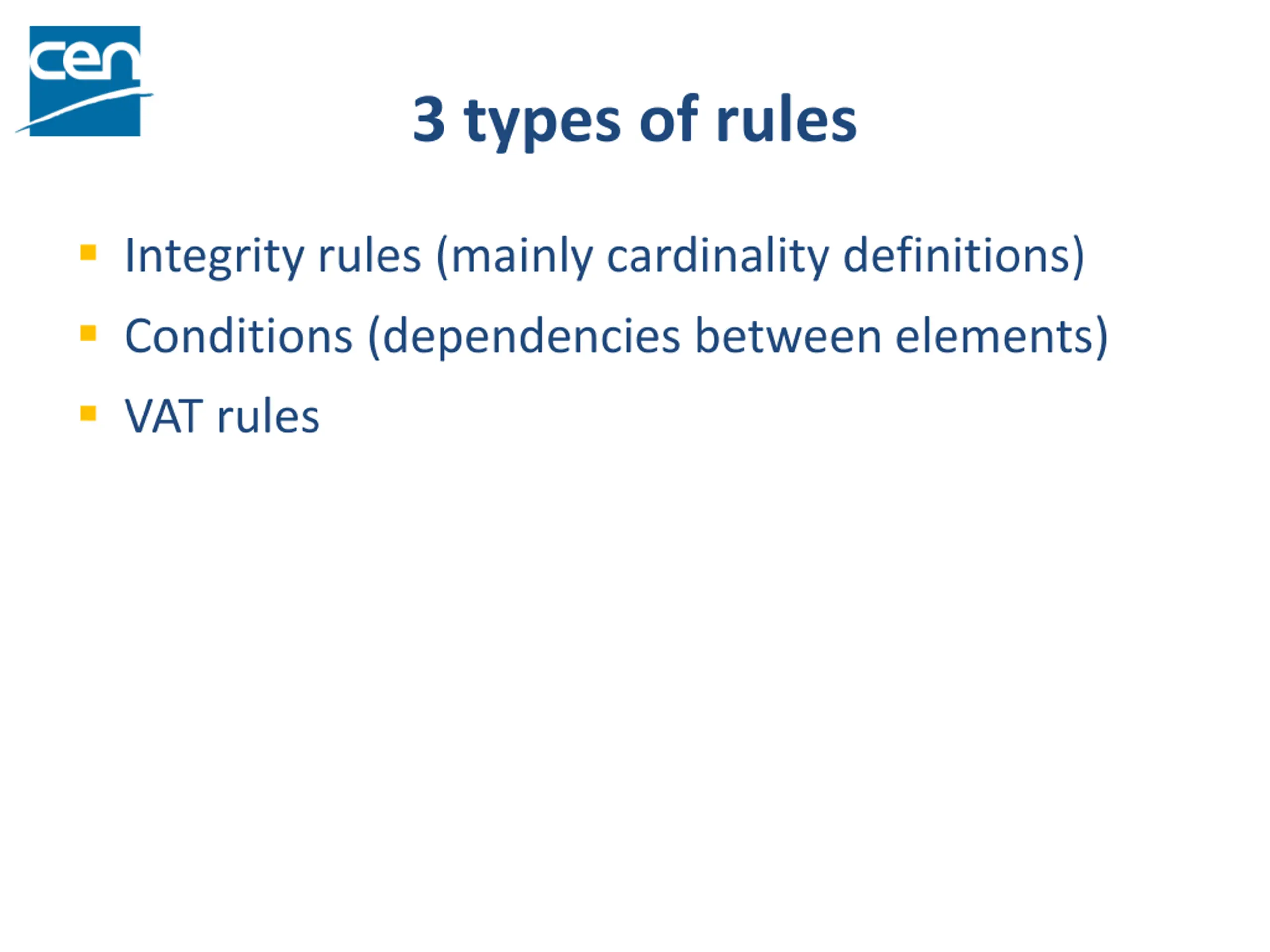 3 types of rules Integrity rules (mainly cardinality definitions) Conditions (dependencies between elements) VAT rules