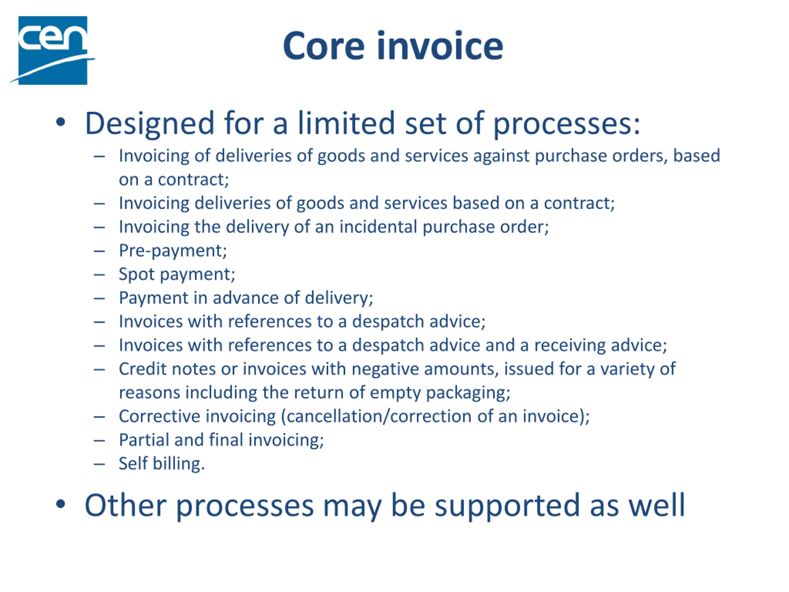 Core invoice Designed for a limited set of processes: Invoicing of deliveries of goods and services against purchase orders, based on a contract; Invoicing deliveries of goods and services based on a contract; Invoicing the delivery of an incidental purchase order; Pre-payment; Spot payment; Payment in advance of delivery; Invoices with references to a despatch advice; Invoices with references to a despatch advice and a receiving advice; Credit notes or invoices with negative amounts, issued for a variety of reasons including the return of empty packaging; Corrective invoicing (cancellation/correction of an invoice); Partial and final invoicing; Self billing. Other processes may be supported as well