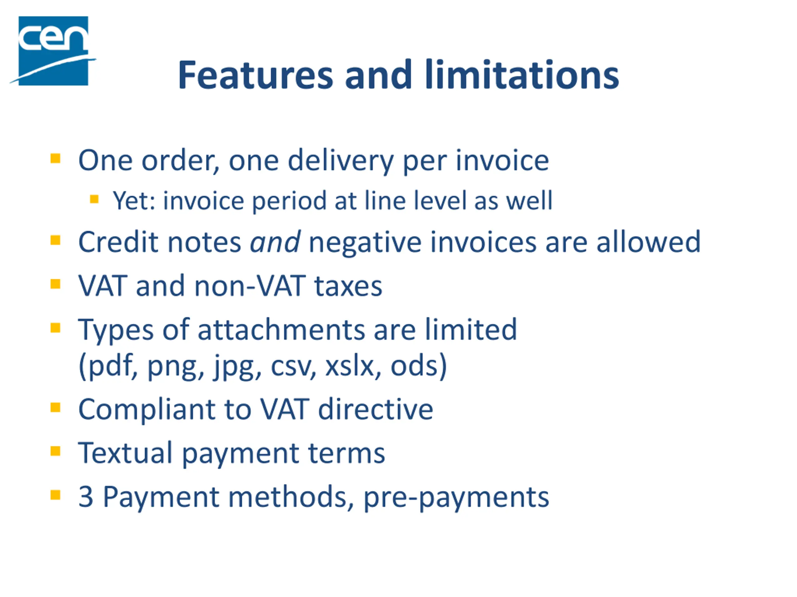 Features and limitations One order, one delivery per invoice Yet: invoice period at line level as well Credit notes and negative invoices are allowed VAT and non-VAT taxes Types of attachments are limited (pdf, png, jpg, csv, xslx, ods) Compliant to VAT directive Textual payment terms 3 Payment methods, pre-payments