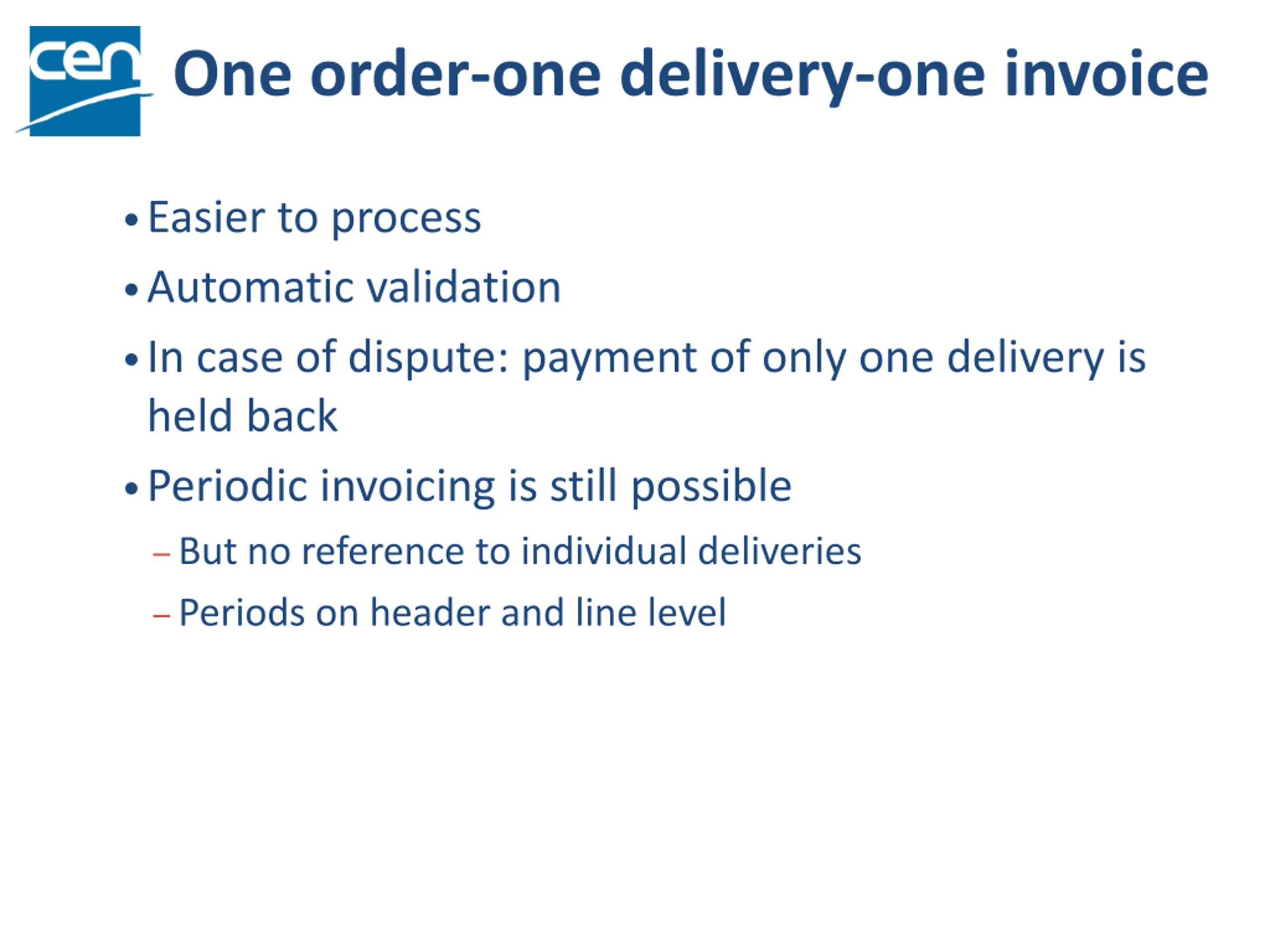 One order-one delivery-one invoice Easier to process Automatic validation In case of dispute: payment of only one delivery is held back Periodic invoicing is still possible But no reference to individual deliveries Periods on header and line level
