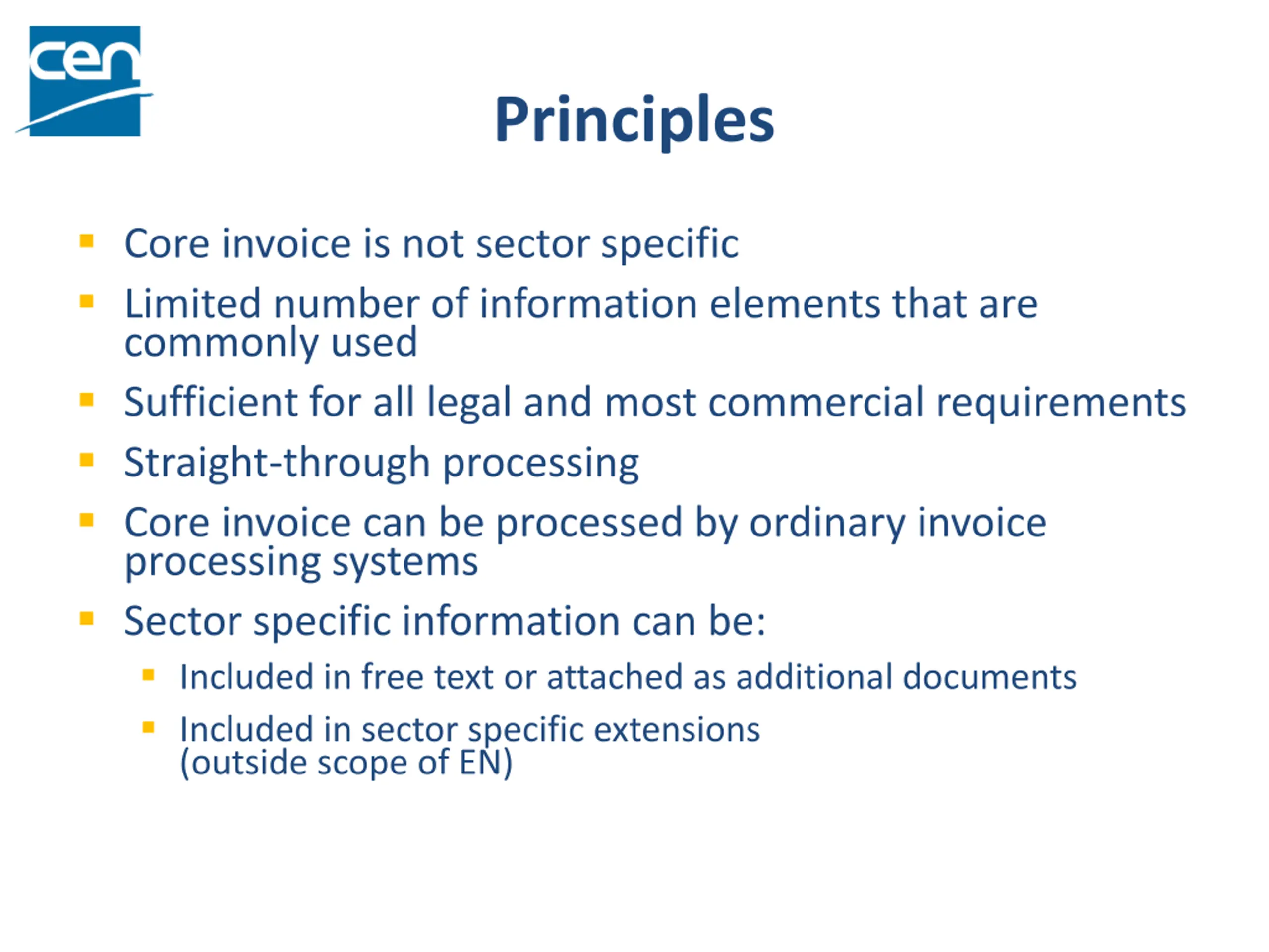 Principles Core invoice is not sector specific Limited number of information elements that are commonly used Sufficient for all legal and most commercial requirements Straight-through processing Core invoice can be processed by ordinary invoice processing systems Sector specific information can be: Included in free text or attached as additional documents Included in sector specific extensions (outside scope of EN)