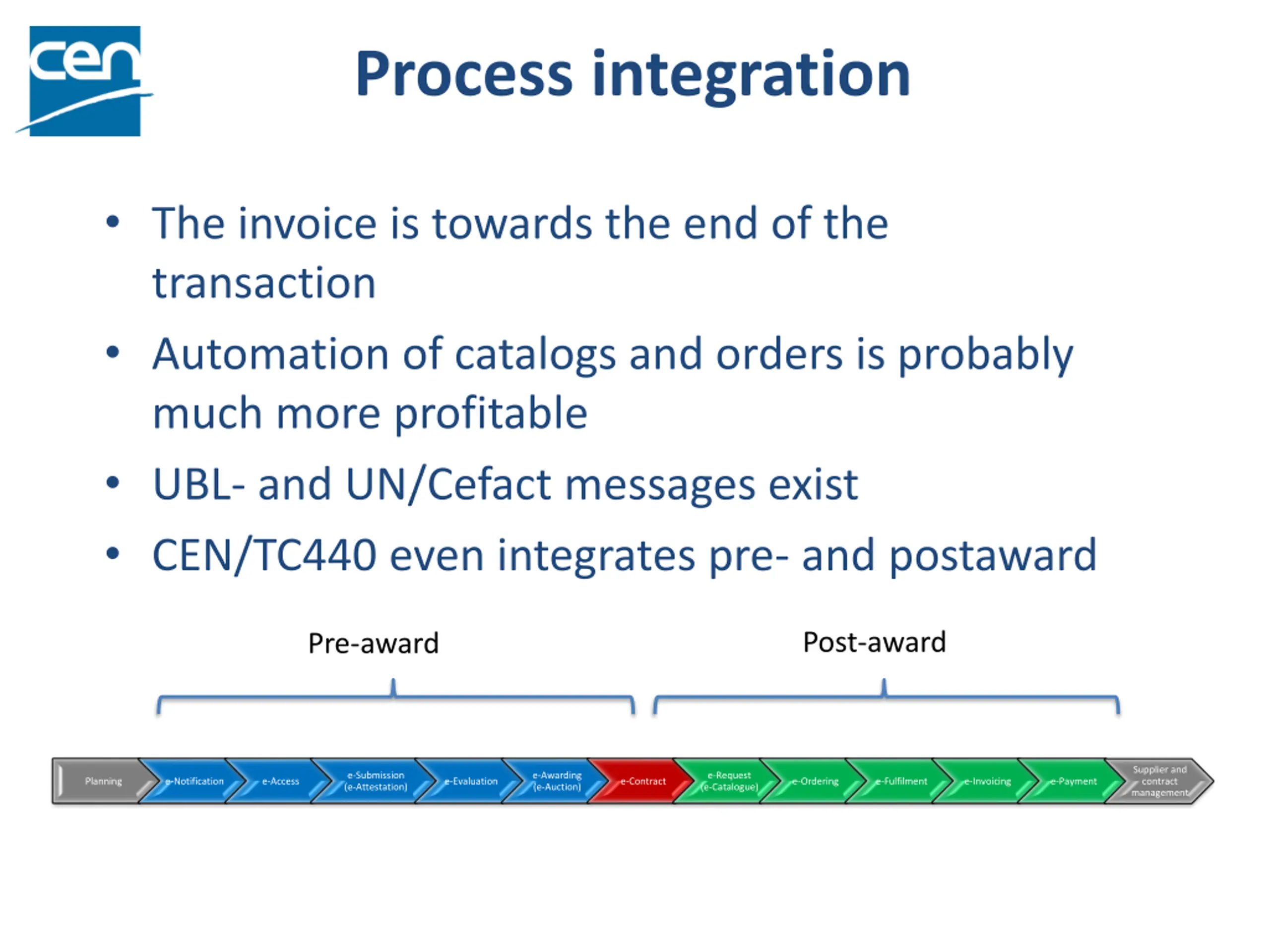 Process integration The invoice is towards the end of the transaction Automation of catalogs and orders is probably much more profitable UBL- and UN/Cefact messages exist CEN/TC440 even integrates pre- and postaward Post-award Pre-award Supplier and contract management e-Submission (e-Attestation) e-Awarding (e-Auction) e-Request (e-Catalogue) Planning e-Notification e-Access e-Evaluation e-Contract e-Ordering e-Fulfilment e-Invoicing e-Payment