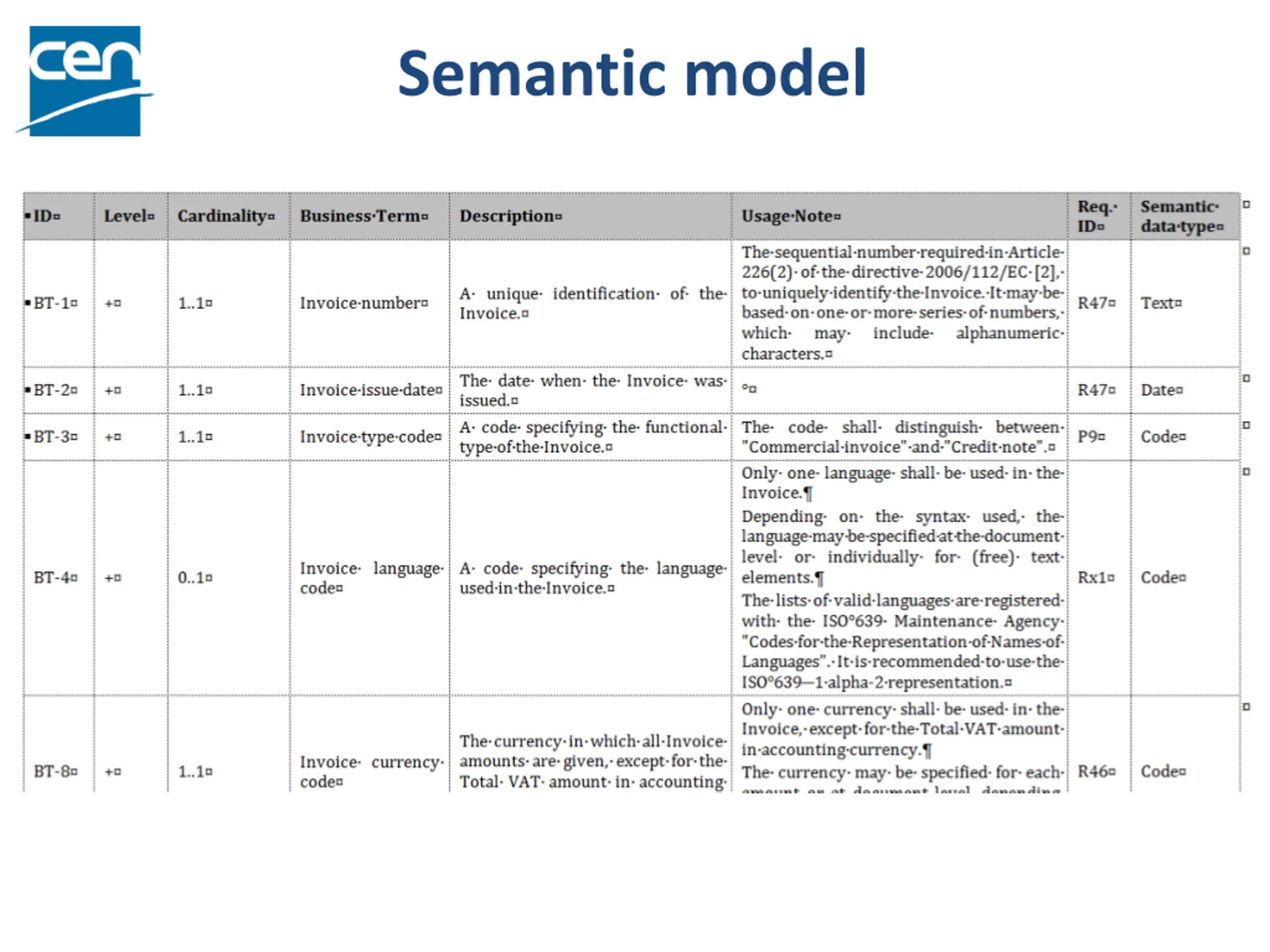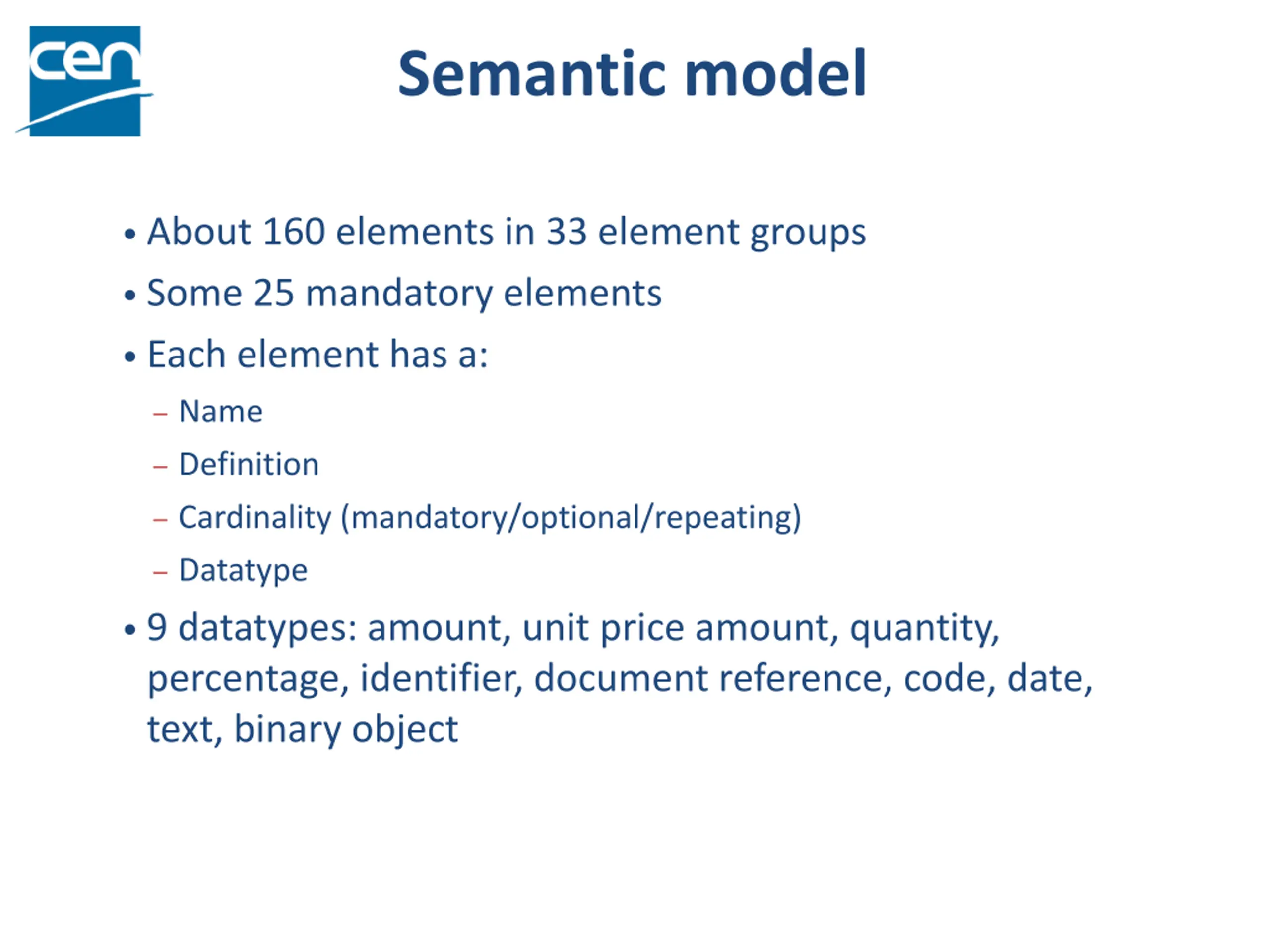 Semantic model About 160 elements in 33 element groups Some 25 mandatory elements Each element has a: Name Definition Cardinality (mandatory/optional/repeating) Datatype 9 datatypes: amount, unit price amount, quantity, percentage, identifier, document reference, code, date, text, binary object