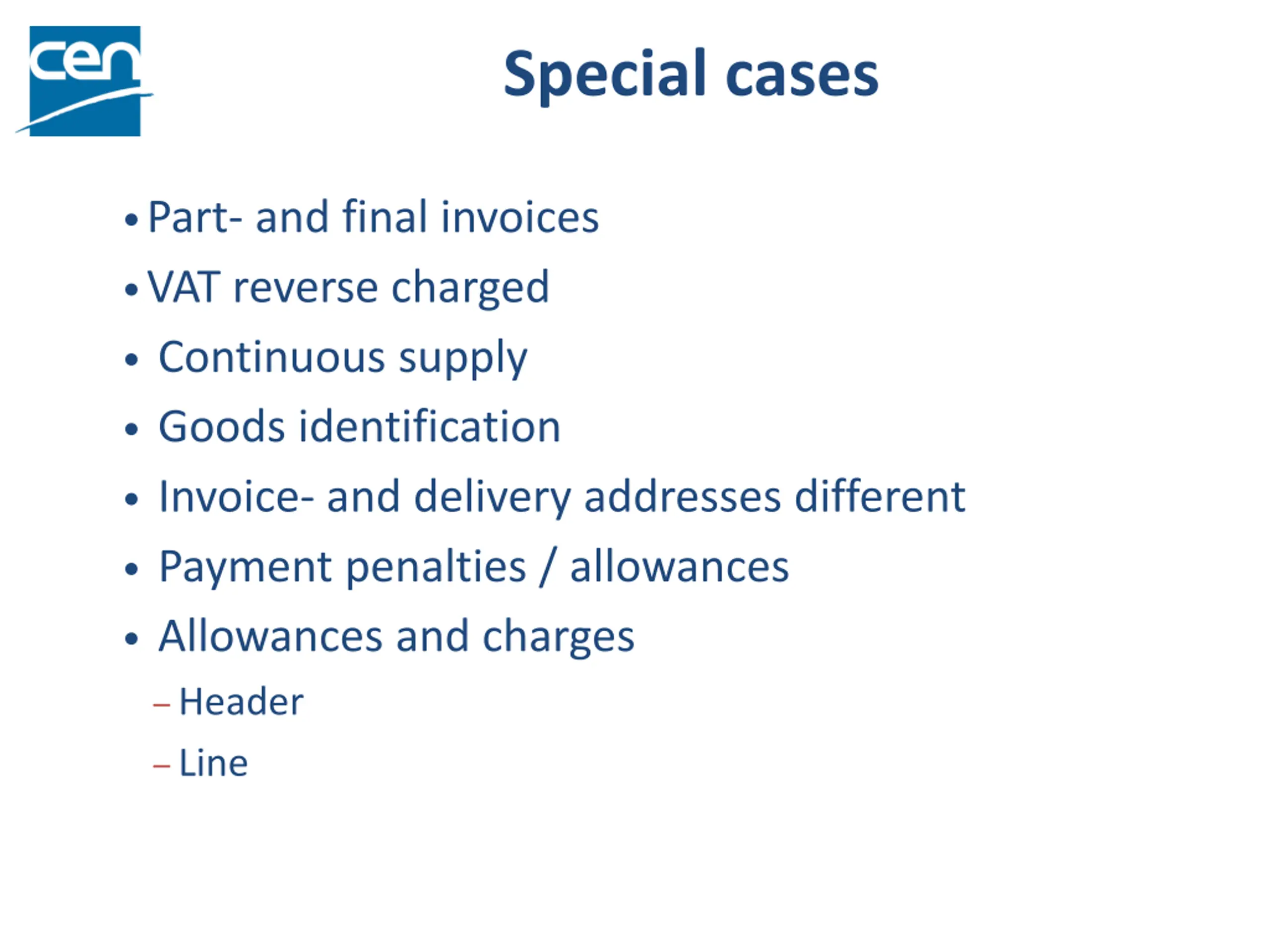 Special cases Part- and final invoices VAT reverse charged Continuous supply Goods identification Invoice- and delivery addresses different Payment penalties / allowances Allowances and charges Header Line