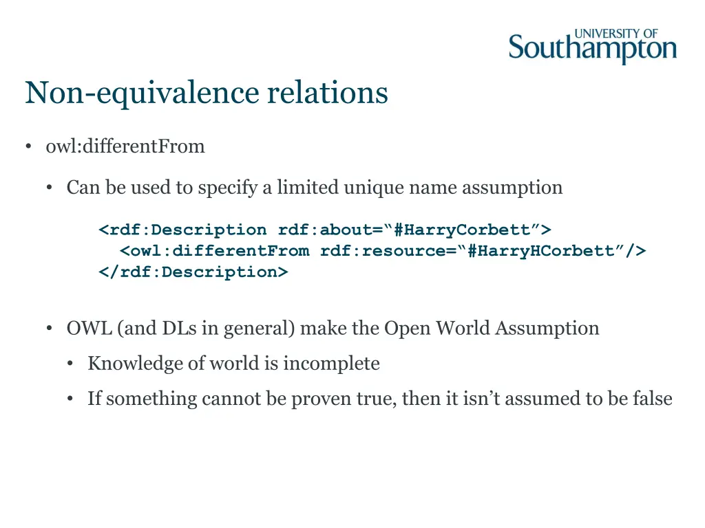 Non-equivalence relations owl:differentFrom Can be used to specify a limited unique name assumption <rdf:Description rdf:about= #HarryCorbett > <owl:differentFrom rdf:resource= #HarryHCorbett /> </rdf:Description> OWL (and DLs in general) make the Open World Assumption Knowledge of world is incomplete If something cannot be proven true, then it isn t assumed to be false