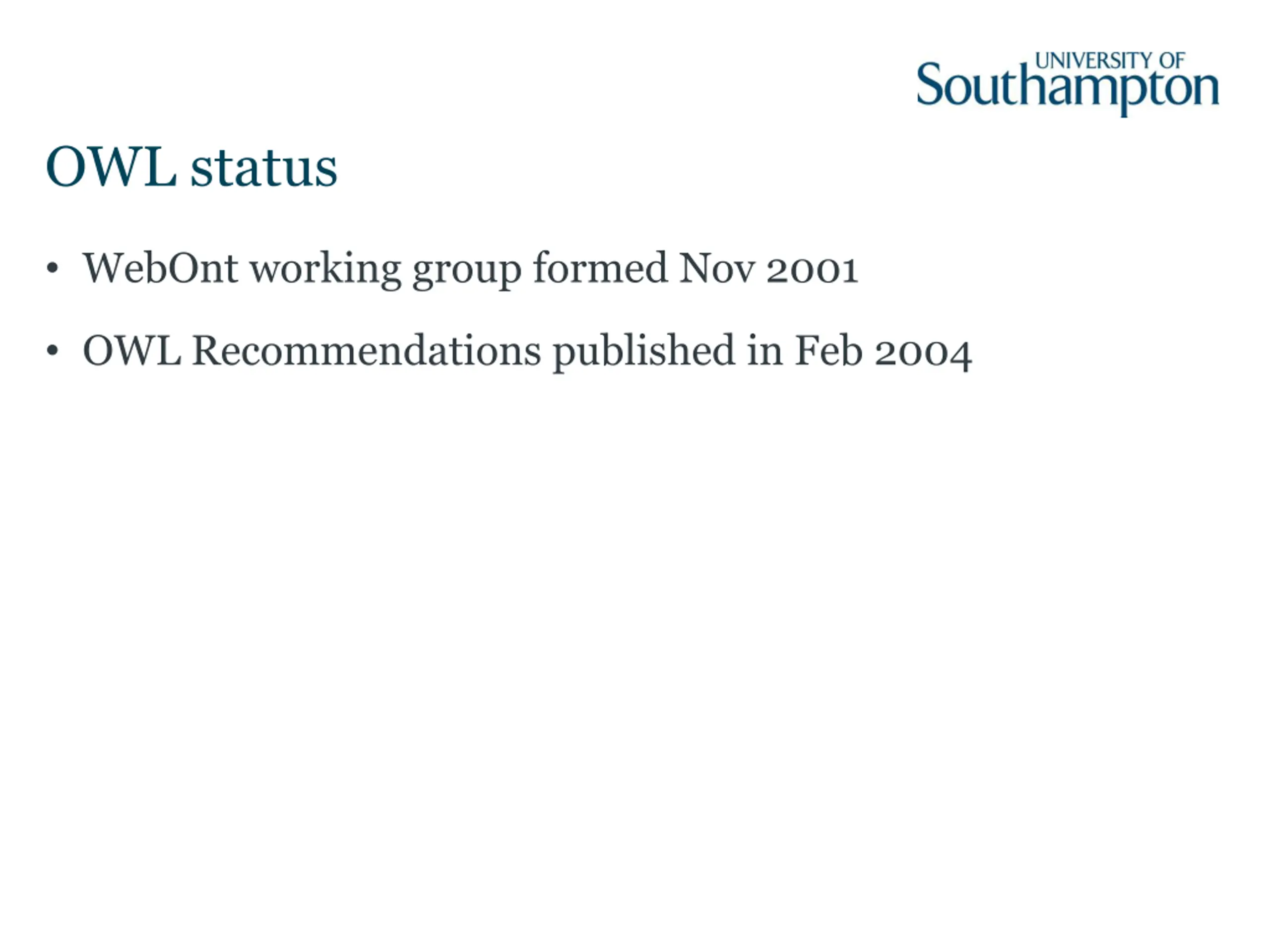 OWL status WebOnt working group formed Nov 2001 OWL Recommendations published in Feb 2004