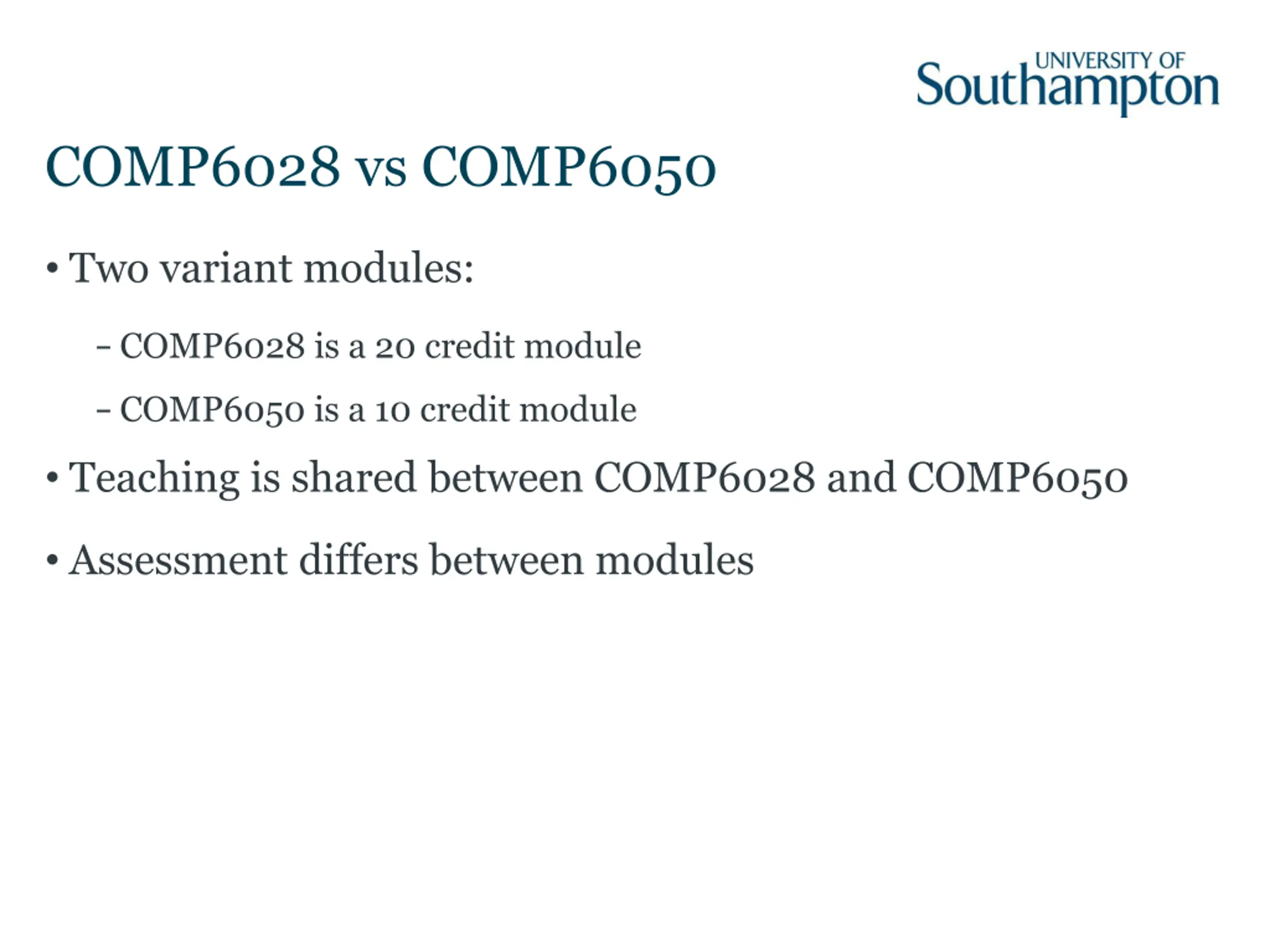 COMP6028 vs COMP6050 Two variant modules: COMP6028 is a 20 credit module COMP6050 is a 10 credit module Teaching is shared between COMP6028 and COMP6050 Assessment differs between modules
