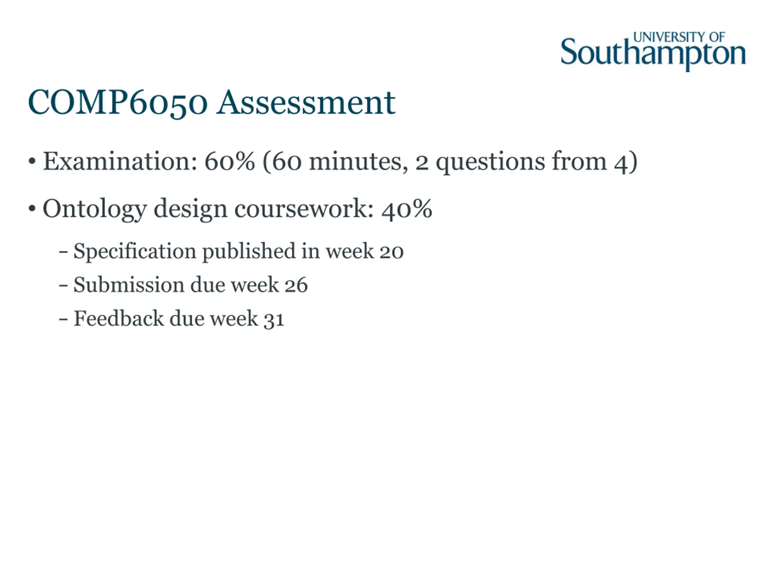 COMP6050 Assessment Examination: 60% (60 minutes, 2 questions from 4) Ontology design coursework: 40% Specification published in week 20 Submission due week 26 Feedback due week 31