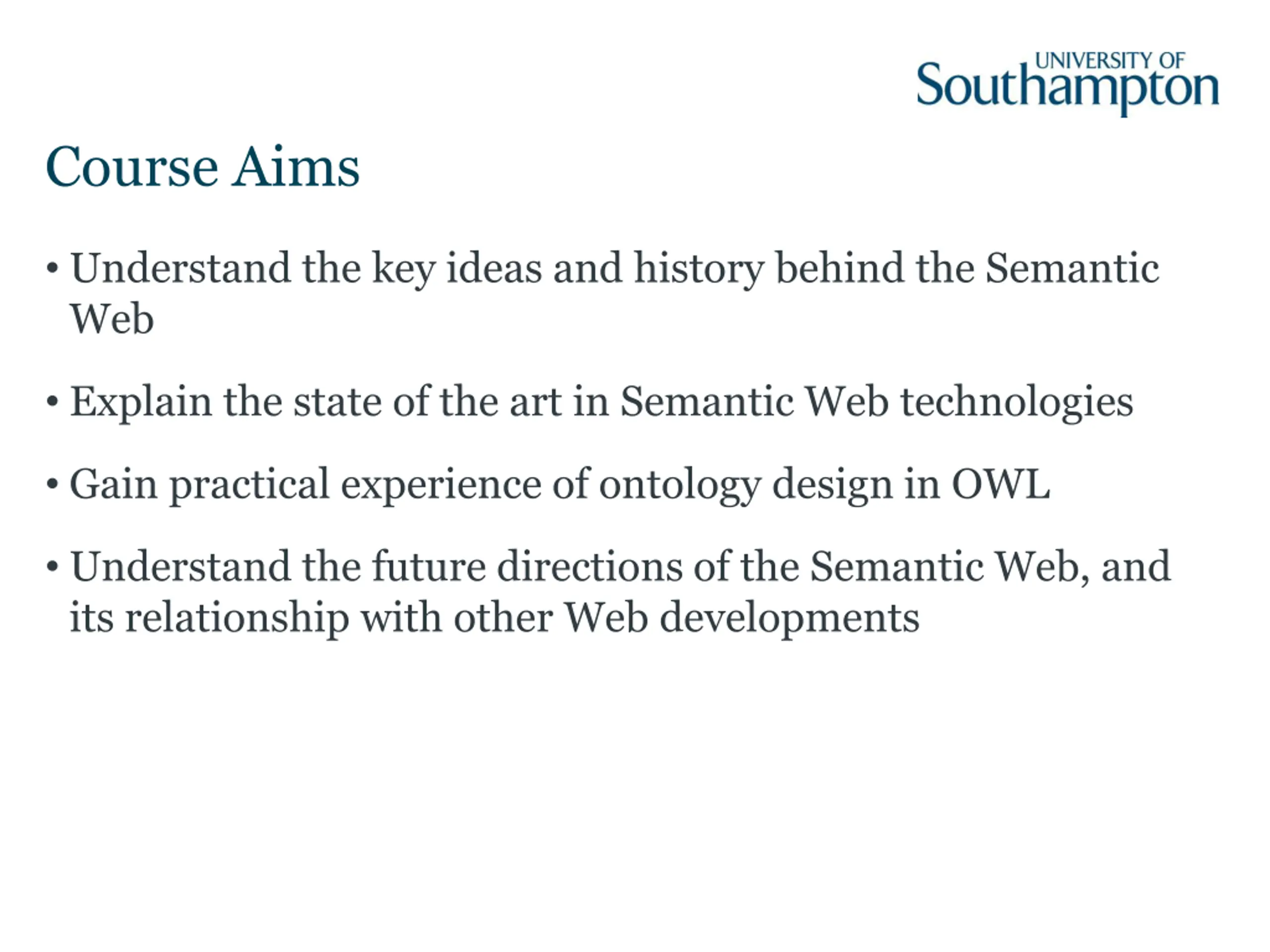 Course Aims Understand the key ideas and history behind the Semantic Web Explain the state of the art in Semantic Web technologies Gain practical experience of ontology design in OWL Understand the future directions of the Semantic Web, and its relationship with other Web developments