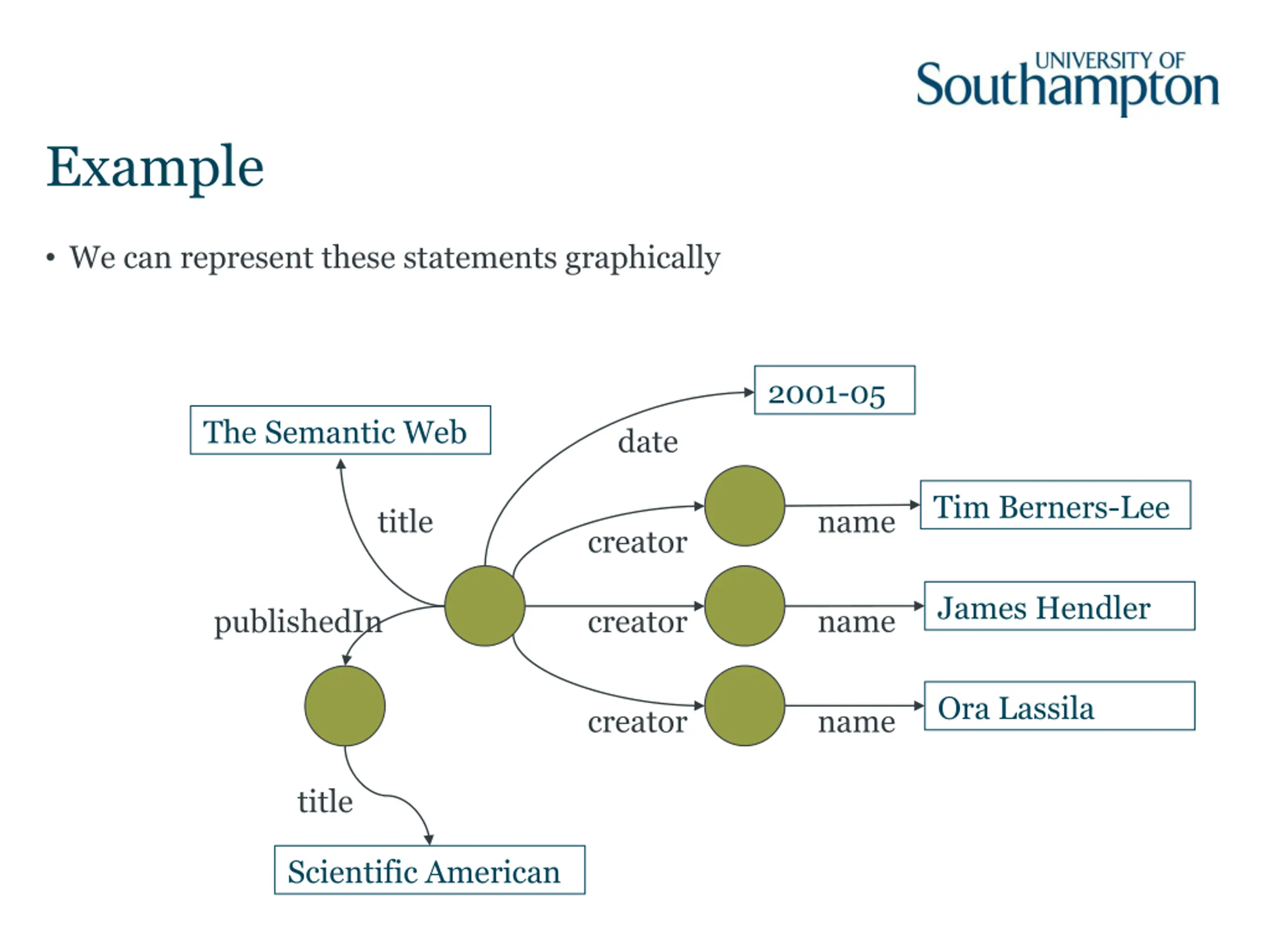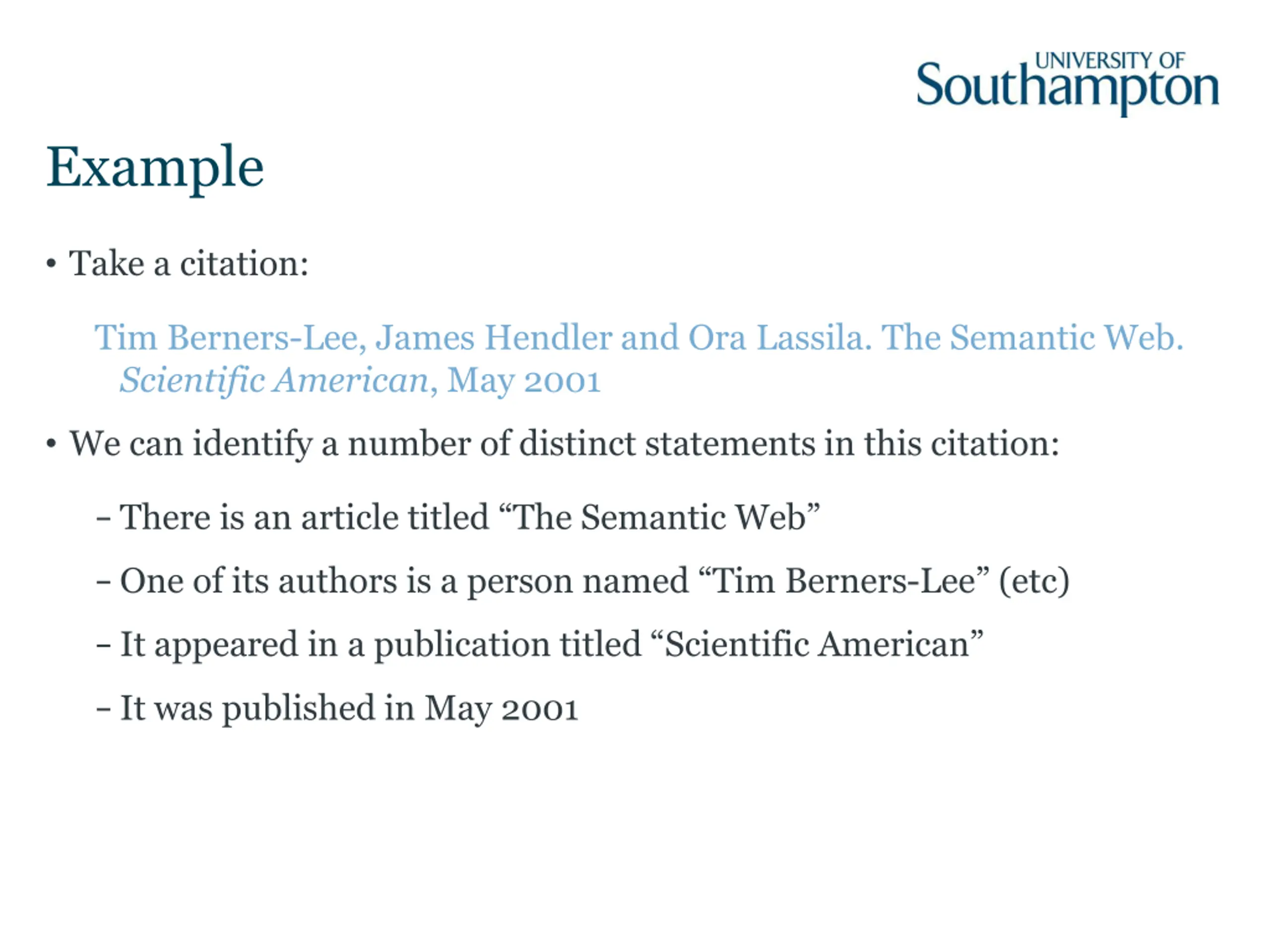 Example Take a citation: Tim Berners-Lee, James Hendler and Ora Lassila. The Semantic Web. Scientific American, May 2001 We can identify a number of distinct statements in this citation: There is an article titled The Semantic Web One of its authors is a person named Tim Berners-Lee (etc) It appeared in a publication titled Scientific American It was published in May 2001