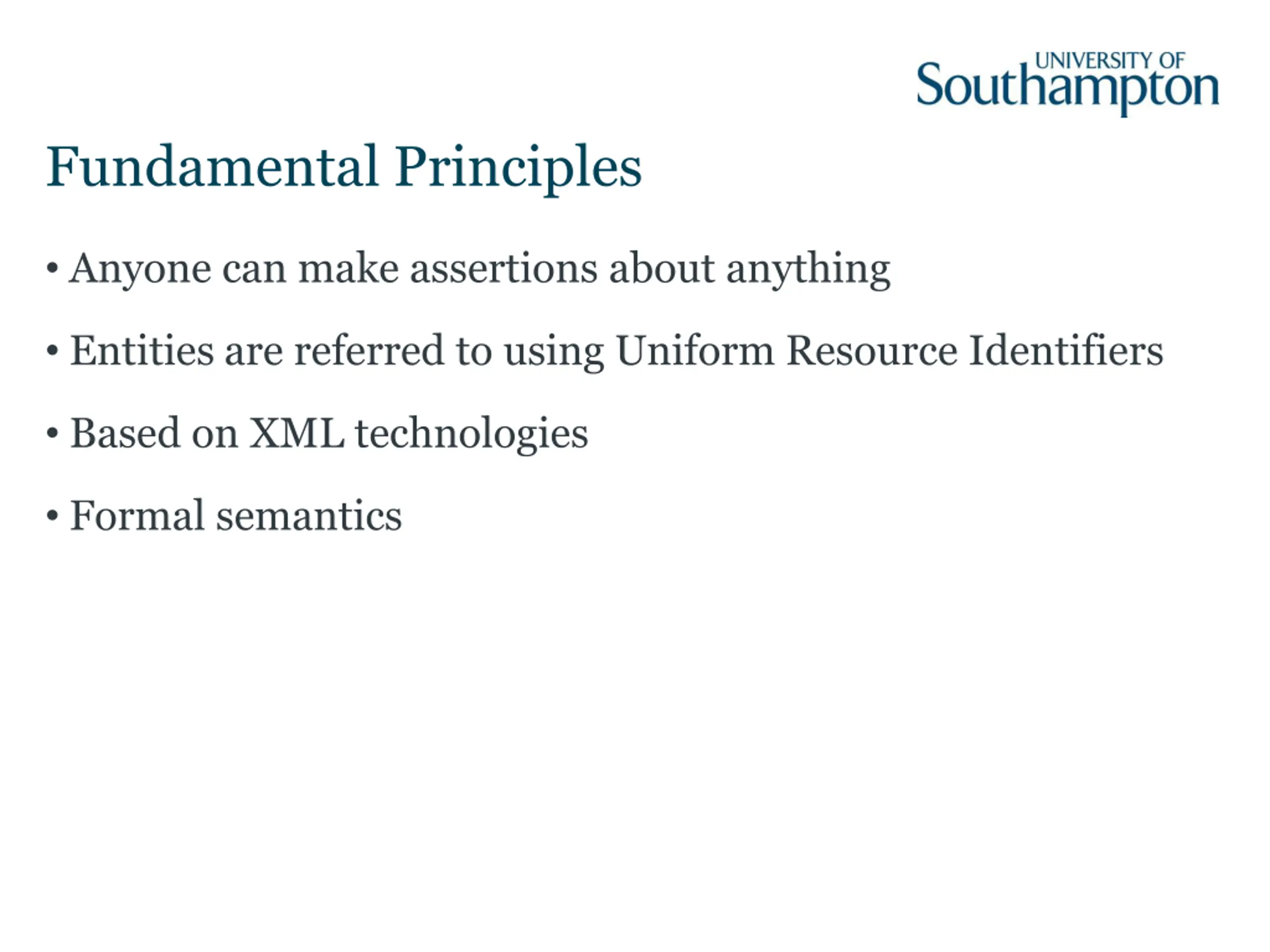 Fundamental Principles Anyone can make assertions about anything Entities are referred to using Uniform Resource Identifiers Based on XML technologies Formal semantics