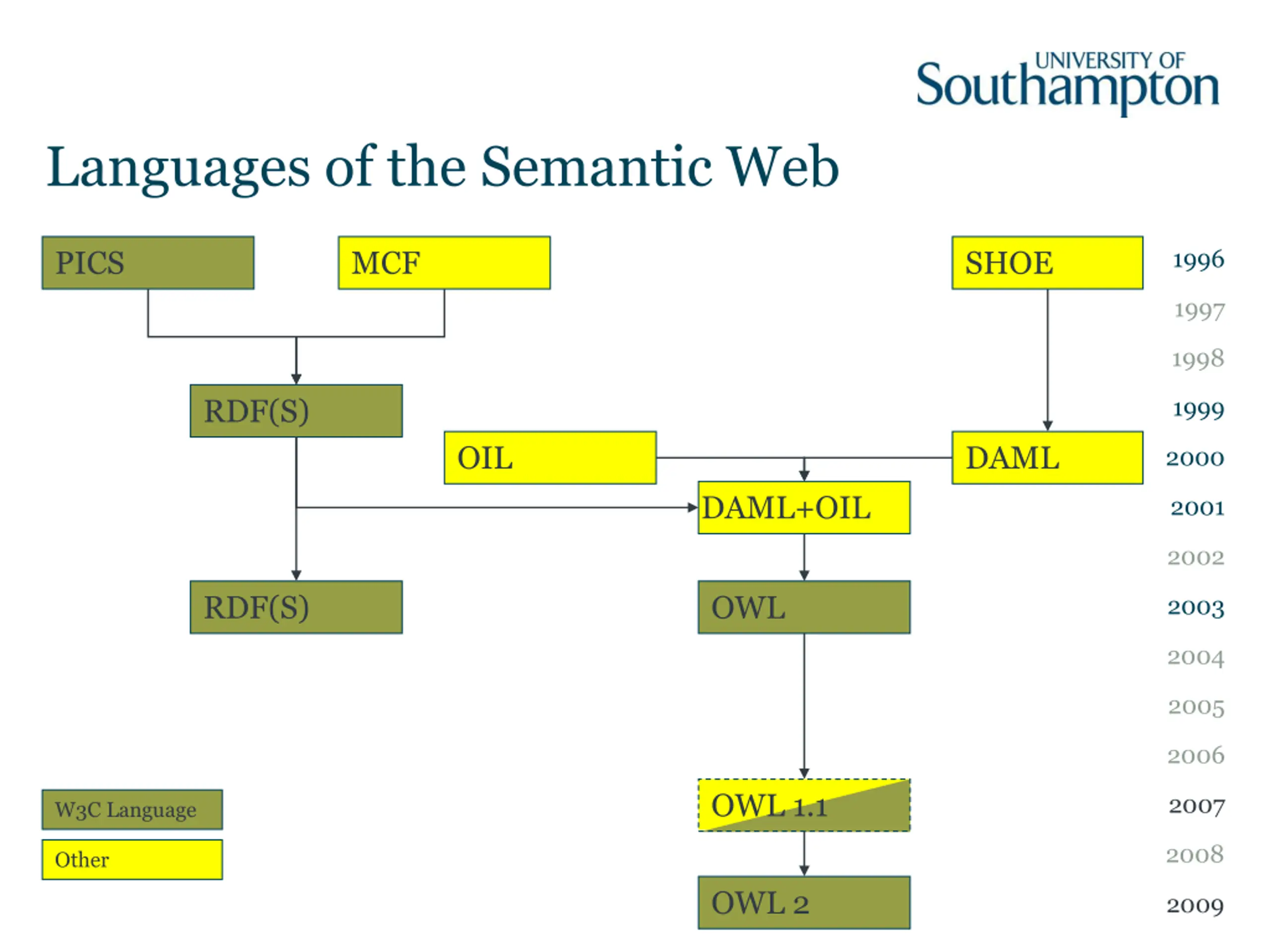 Languages of the Semantic Web 1996 PICS MCF SHOE 1997 1998 RDF(S) 1999 OIL DAML 2000 DAML+OIL 2001 2002 RDF(S) OWL 2003 2004 2005 2006 OWL 1.1 2007 W3C Language 2008 Other OWL 2 2009