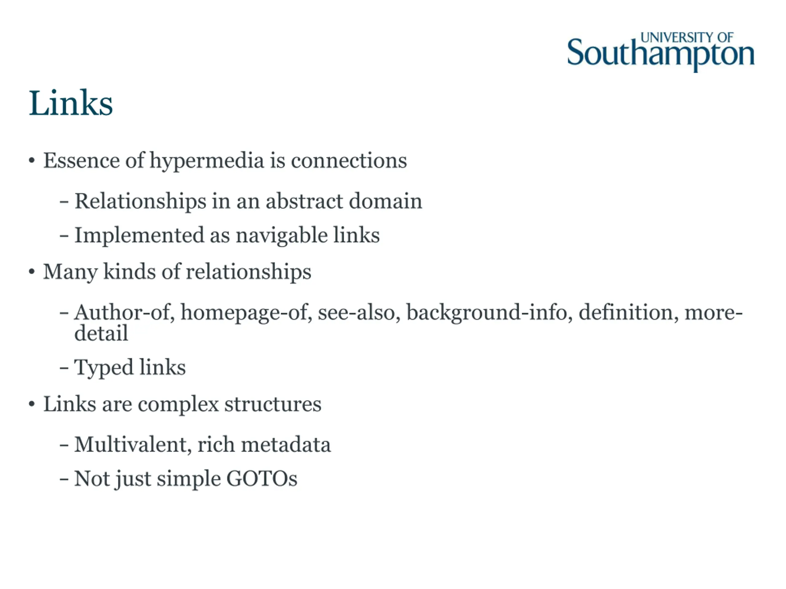 Links Essence of hypermedia is connections Relationships in an abstract domain Implemented as navigable links Many kinds of relationships Author-of, homepage-of, see-also, background-info, definition, more- detail Typed links Links are complex structures Multivalent, rich metadata Not just simple GOTOs