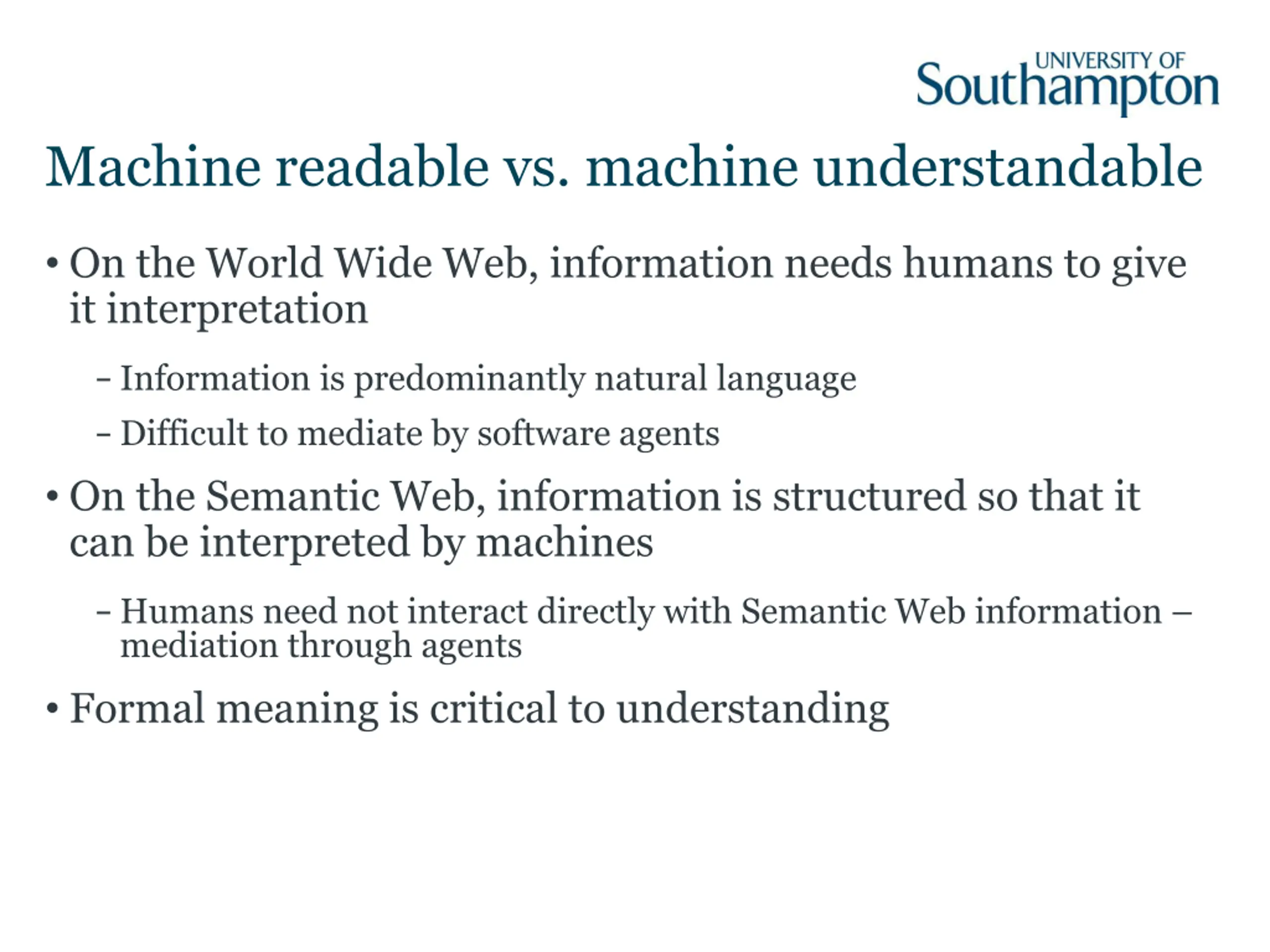 Machine readable vs. machine understandable On the World Wide Web, information needs humans to give it interpretation Information is predominantly natural language Difficult to mediate by software agents On the Semantic Web, information is structured so that it can be interpreted by machines Humans need not interact directly with Semantic Web information mediation through agents Formal meaning is critical to understanding
