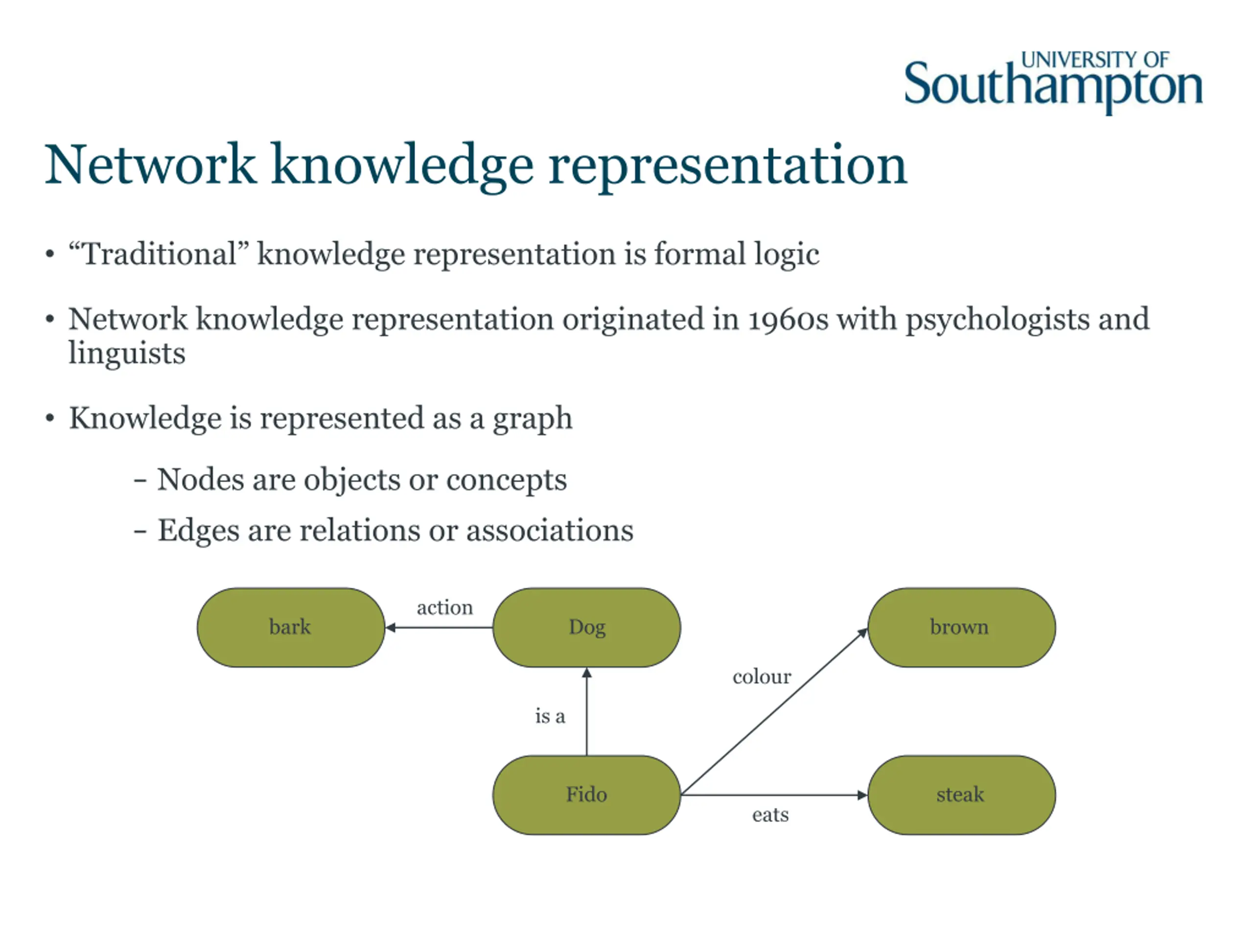 Network knowledge representation Traditional knowledge representation is formal logic Network knowledge representation originated in 1960s with psychologists and linguists Knowledge is represented as a graph Nodes are objects or concepts Edges are relations or associations action bark Dog brown colour is a Fido steak eats