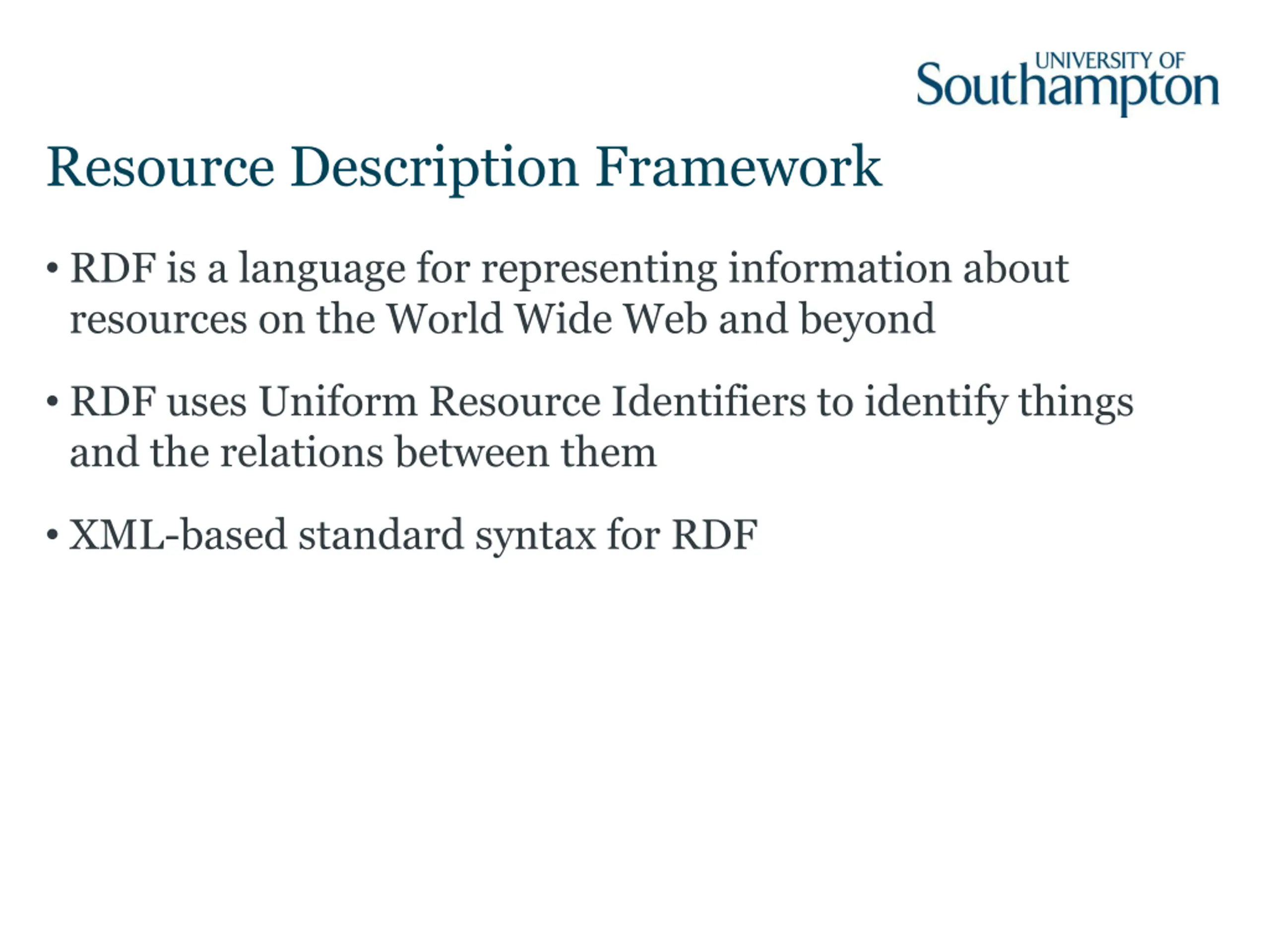 Resource Description Framework RDF is a language for representing information about resources on the World Wide Web and beyond RDF uses Uniform Resource Identifiers to identify things and the relations between them XML-based standard syntax for RDF