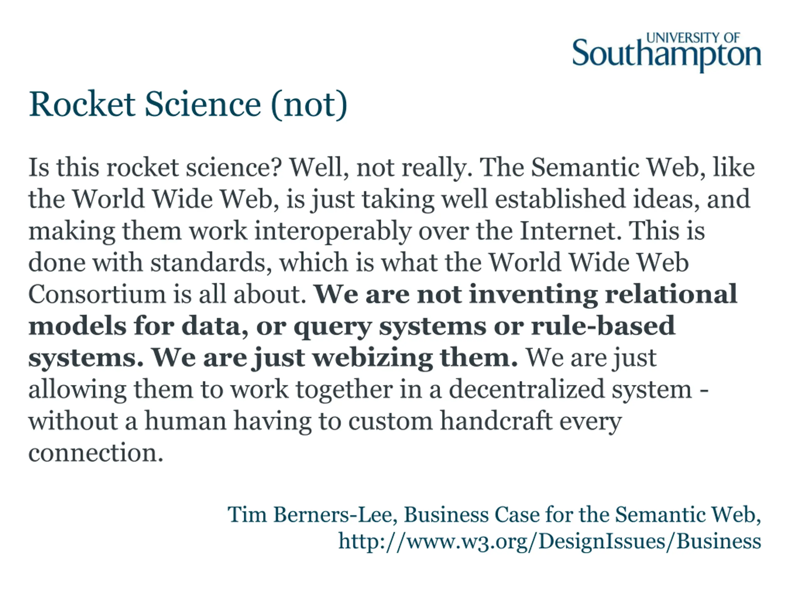 Rocket Science (not) Is this rocket science? Well, not really. The Semantic Web, like the World Wide Web, is just taking well established ideas, and making them work interoperably over the Internet. This is done with standards, which is what the World Wide Web Consortium is all about. We are not inventing relational models for data, or query systems or rule-based systems. We are just webizing them. We are just allowing them to work together in a decentralized system - without a human having to custom handcraft every connection. Tim Berners-Lee, Business Case for the Semantic Web, http://www.w3.org/DesignIssues/Business