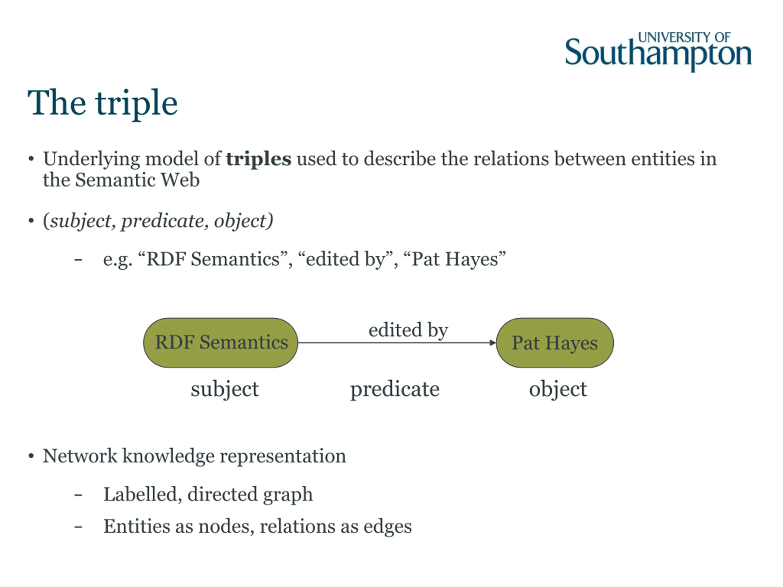 The triple Underlying model of triplesused to describe the relations between entities in the Semantic Web (subject, predicate, object) e.g. RDF Semantics , edited by , Pat Hayes edited by RDF Semantics Pat Hayes subject predicate object Network knowledge representation Labelled, directed graph Entities as nodes, relations as edges