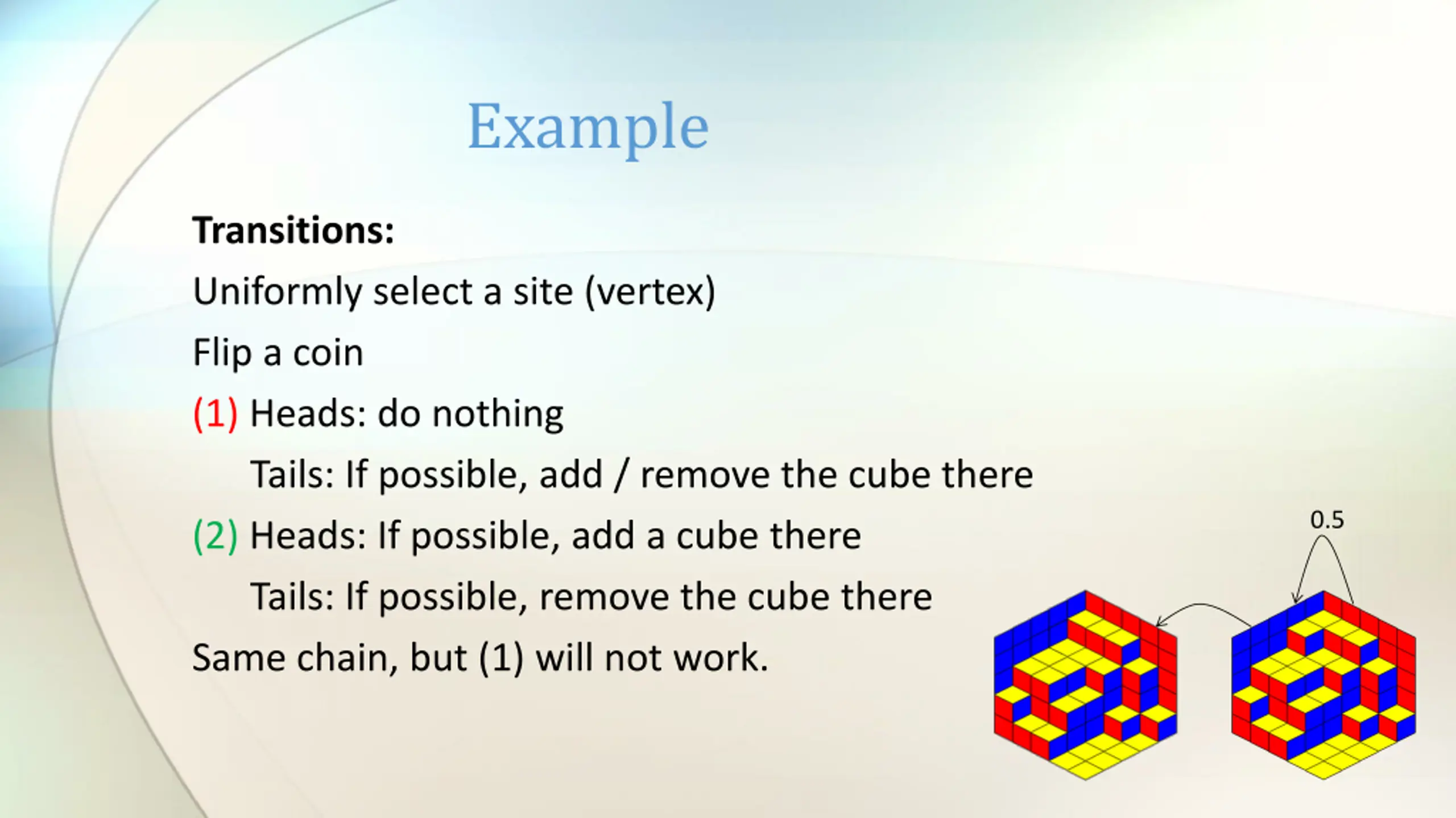 Example Transitions: Uniformly select a site (vertex) Flip a coin (1) Heads: do nothing Tails: If possible, add / remove the cube there (2) Heads: If possible, add a cube there Tails: If possible, remove the cube there Same chain, but (1) will not work. 0.5