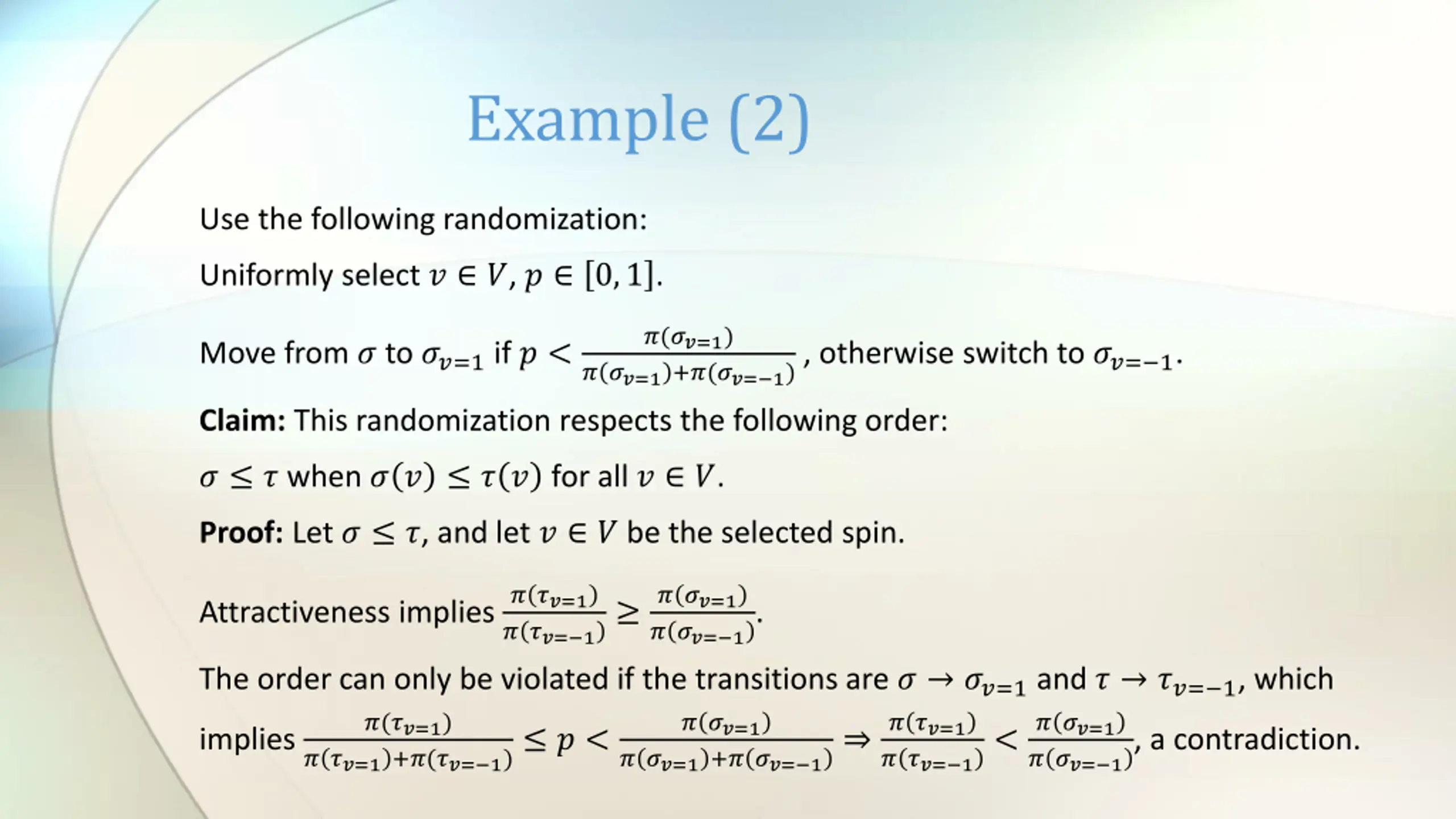 Example (2) Use the following randomization: Uniformly select ? ?, ? 0,1 . ?(??=1) Move from ? to ??=1 if ? < ? ??=1+?(??= 1), otherwise switch to ??= 1. Claim: This randomization respects the following order: ? ? when ? ? ? ? for all ? ?. Proof: Let ? ?, and let ? ? be the selected spin. Attractiveness implies ? ??=1 ? ??=1 ? ??= 1. ? ??= 1 The order can only be violated if the transitions are ? ??=1 and ? ??= 1, which ?(??=1) ? ??=1+?(??= 1) ? < ? ??=1 ? ??=1 ? ??= 1< ? ??=1 ? ??= 1, a contradiction. ? ??=1+? ??= 1 implies