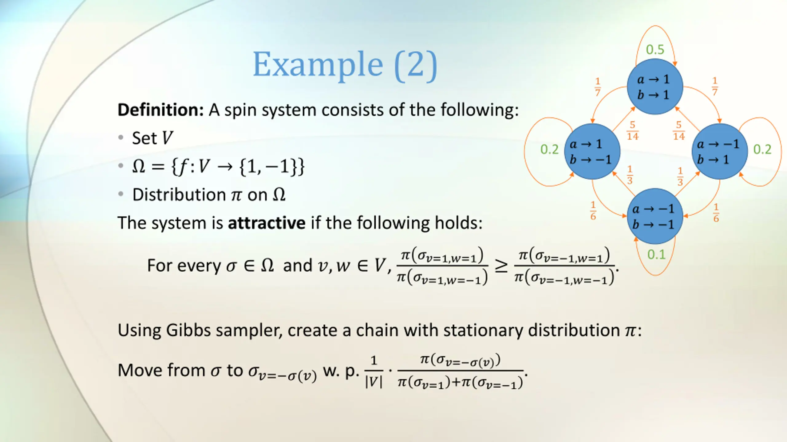 Example (2) 0.5 ? 1 ? 1 1 7 1 7 Definition: A spin system consists of the following: Set ? = ?:? {1, 1} Distribution ? on The system is attractive if the following holds: 5 14 5 14 ? 1 ? 1 ? 1 ? 1 0.2 0.2 1 3 1 3 1 6 1 6 ? 1 ? 1 0.1 ? ??=1,?=1 ? ??=1,?= 1 ? ??= 1,?=1 ? ??= 1,?= 1. For every ? and ?,? ?, Using Gibbs sampler, create a chain with stationary distribution ?: ?(??= ?(?)) ? ??=1+?(??= 1). 1 ? Move from ? to ??= ?(?) w. p.