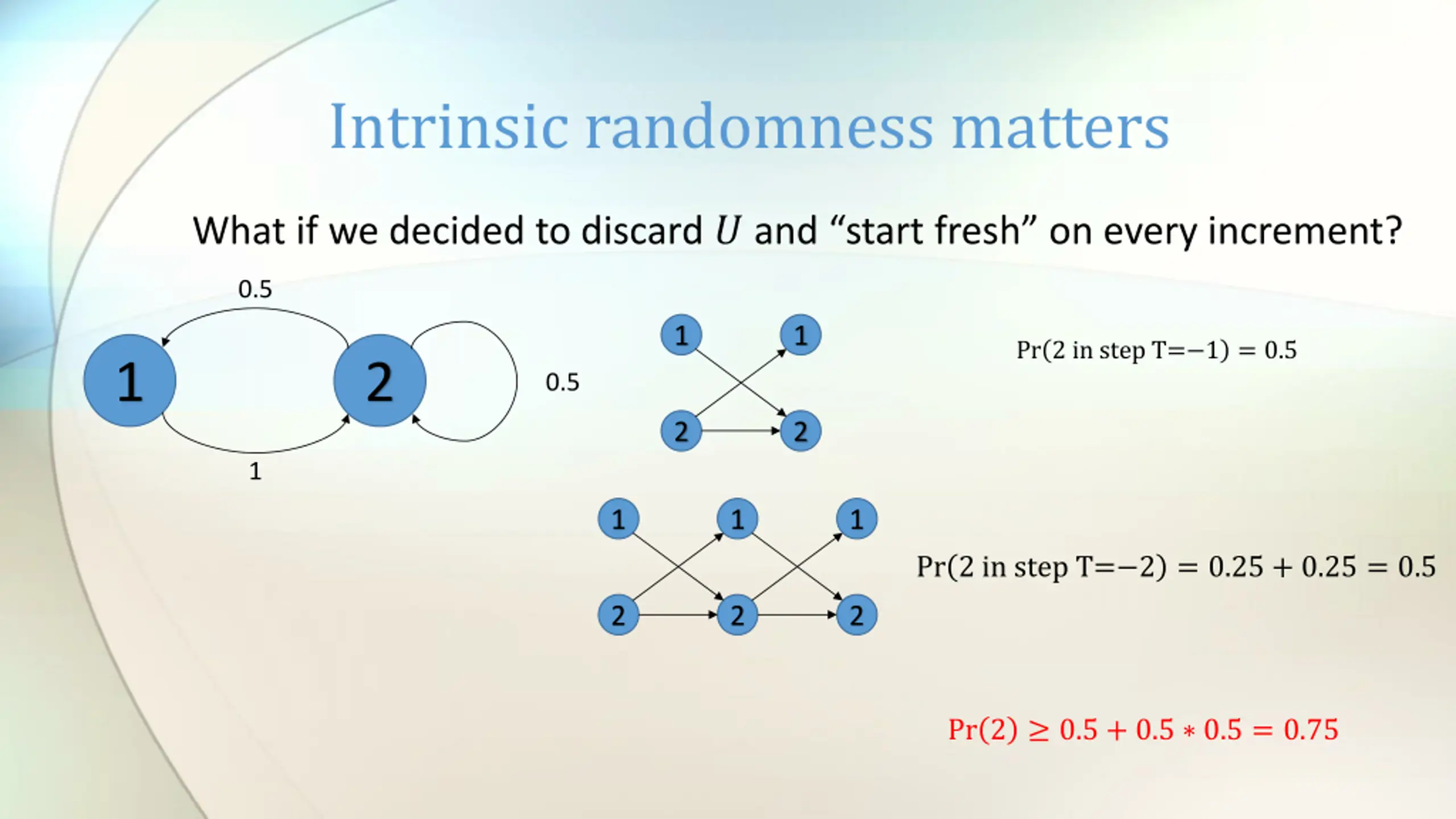 Intrinsic randomness matters What if we decided to discard ? and start fresh on every increment? 0.5 1 1 Pr 2 in step T= 1 = 0.5 1 2 0.5 2 2 1 1 1 1 Pr 2 in step T= 2 = 0.25 + 0.25 = 0.5 2 2 2 Pr 2 0.5 + 0.5 0.5 = 0.75