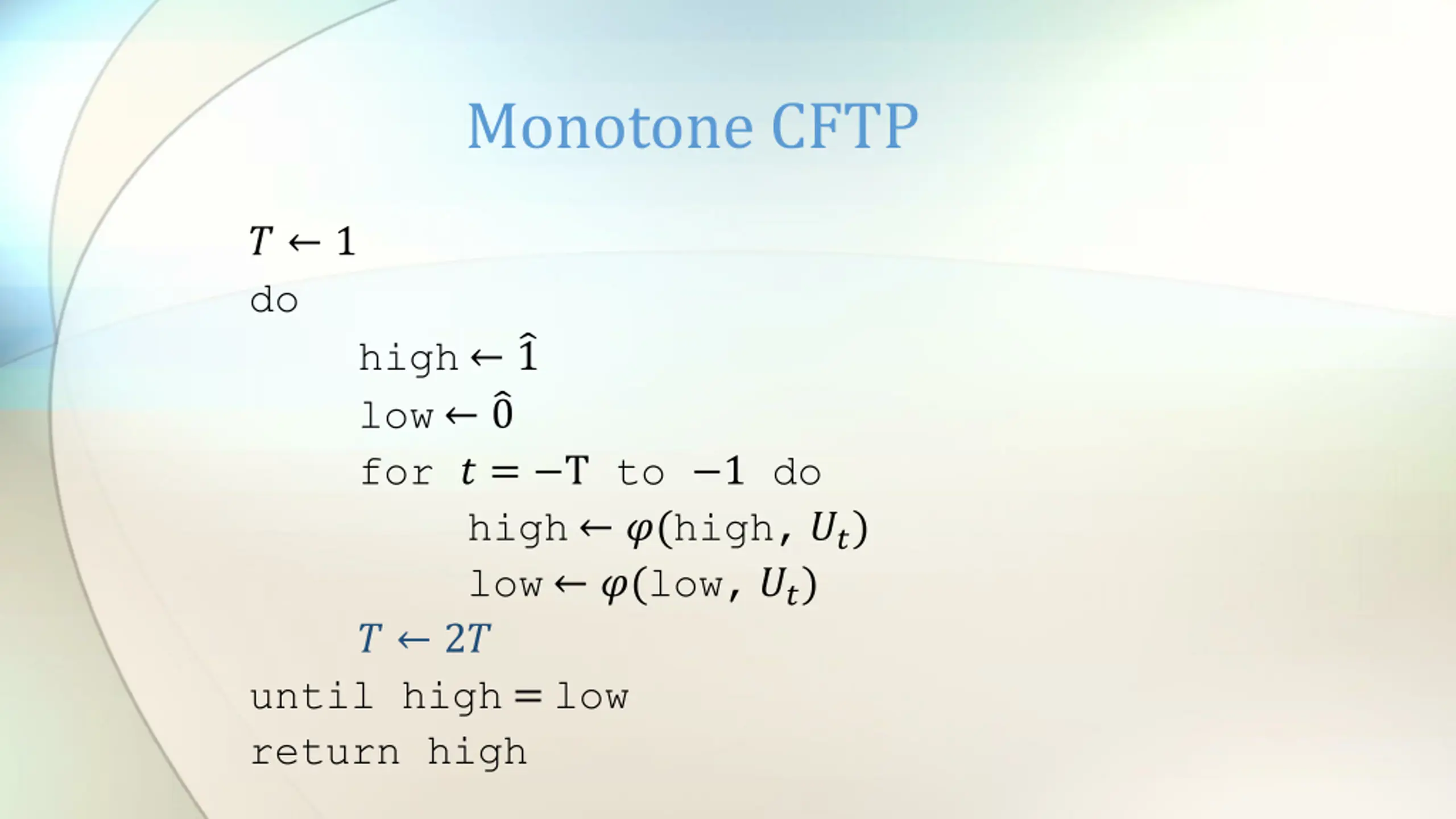 Monotone CFTP ? 1 do high 1 low 0 for ? = T to 1 do high ?(high, ??) low ?(low, ??) ? 2? until high = low return high