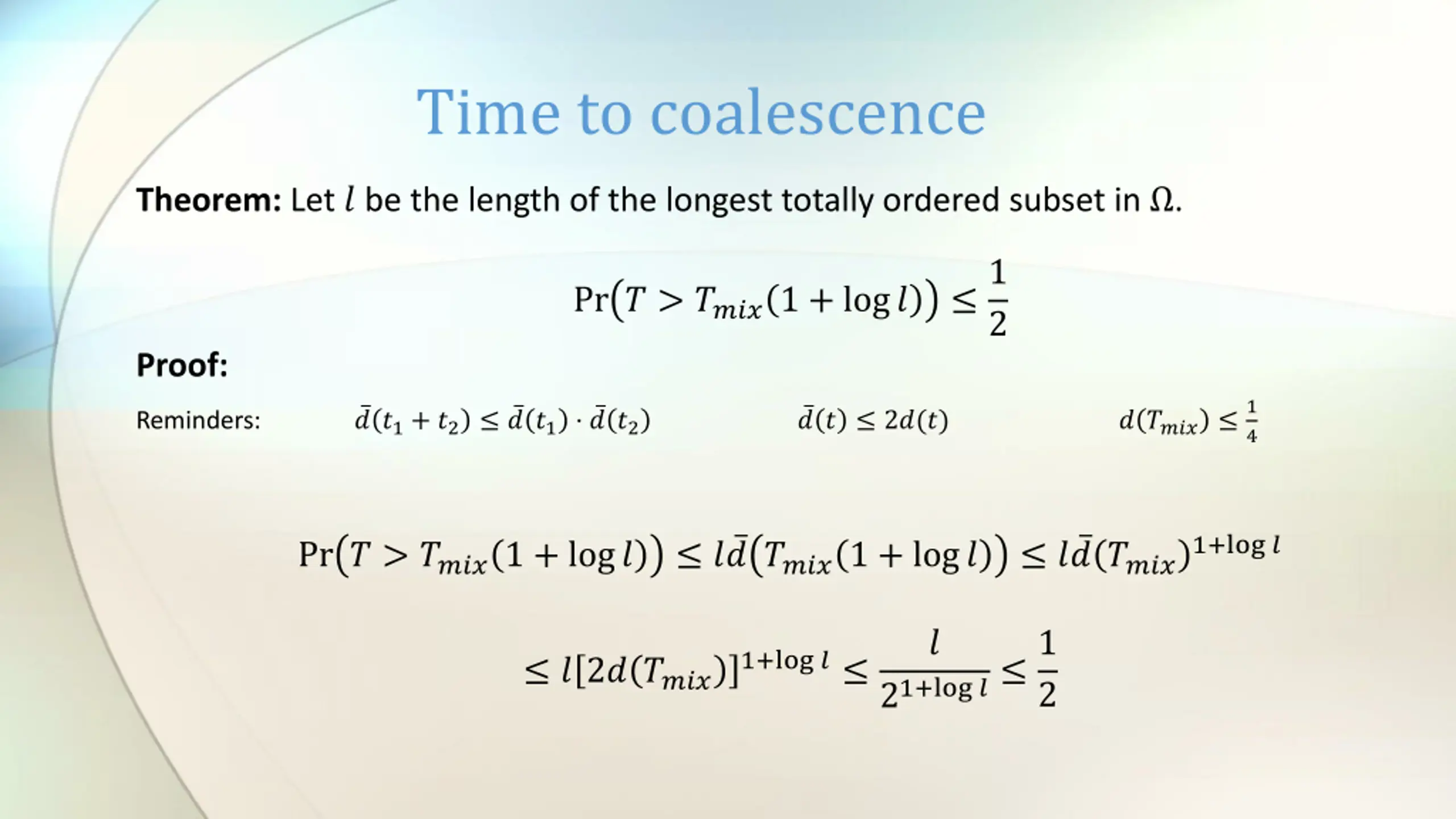 Time to coalescence Theorem: Let ?be the length of the longest totally ordered subset in . 1 Pr ? > ????1 + log? 2 Proof: ? ???? 1 ? ?1+ ?2 ? ?1 ? ?2 ? ? 2?(?) Reminders: 4 1+log ? Pr ? > ????1 + log? ? ? ????1 + log? ? ? ???? 21+log ? 1 ? 1+log ? ? 2? ???? 2