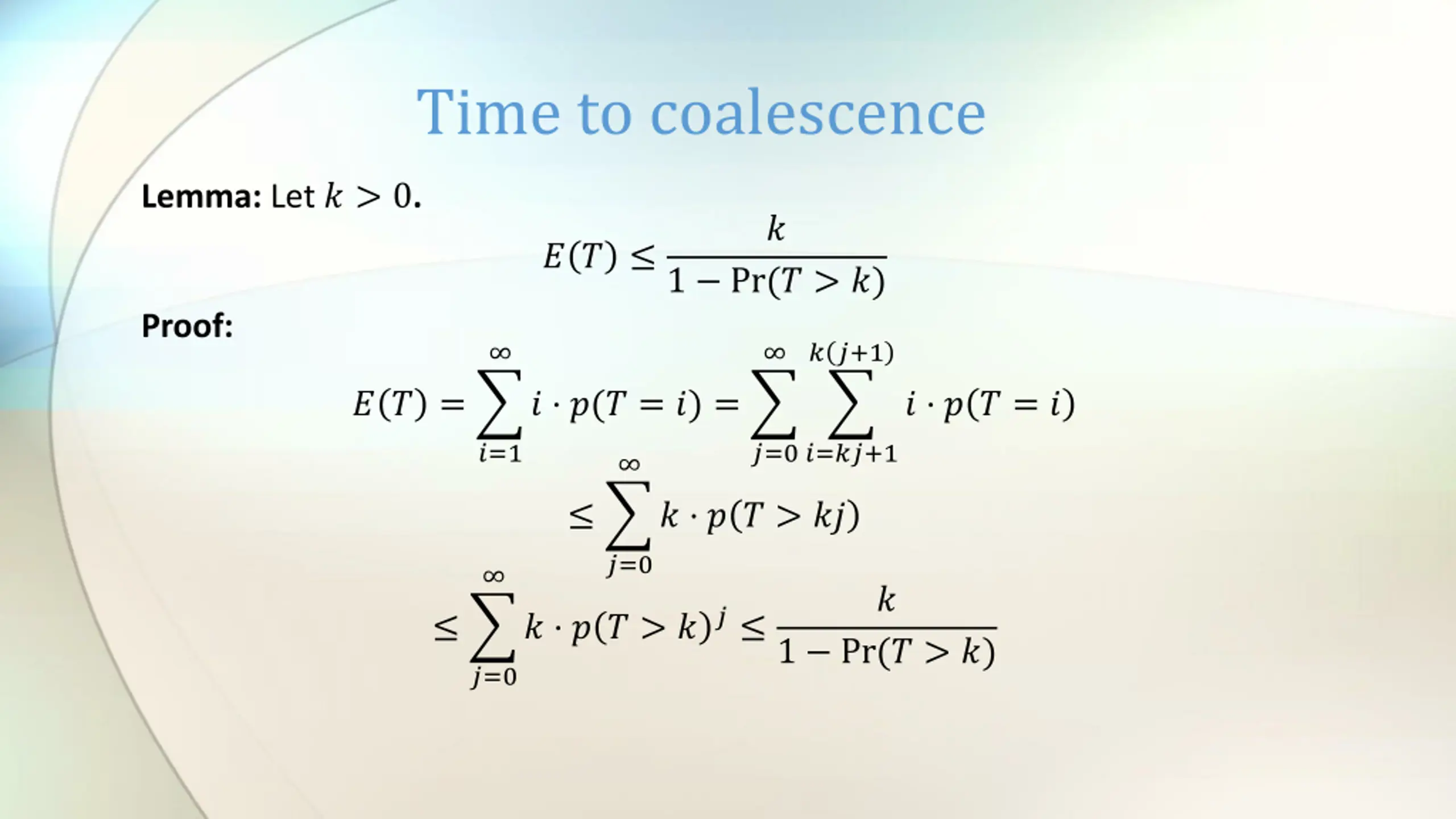Time to coalescence Lemma: Let ? > 0. ? ? ? 1 Pr(? > ?) Proof: ? ?+1 ? ? = ? ?(? = ?) = ? ? ? = ? ?=1 ?=0 ?=??+1 ? ? ? > ?? ?=0 ? ? ? ? > ?? 1 Pr(? > ?) ?=0