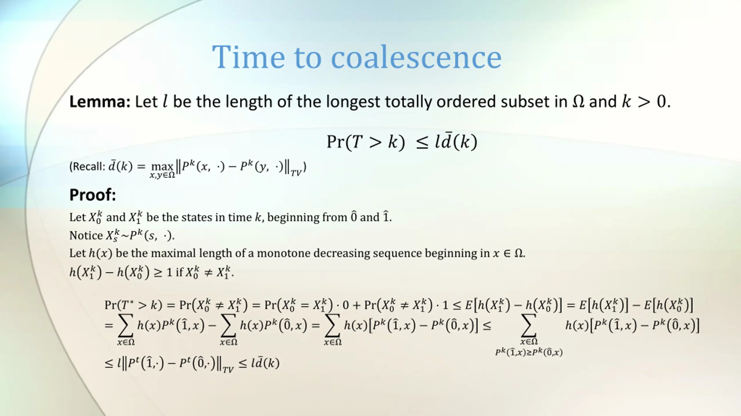 Time to coalescence Lemma: Let ?be the length of the longest totally ordered subset in and ? > 0. Pr(? > ?) ? ? ? ?,? ???, ???, (Recall: ? ? = max ??) Proof: ? be the states in time ?, beginning from 0 and 1. ? and ?1 Let ?0 Notice ???~???, . Let (?) be the maximal length of a monotone decreasing sequence beginning in ? . ? 1 if ?0 ? ?1 ? ?0 ?. ?1 ? ?1 ?= ?1 ? ?1 ? ? ?= Pr ?0 ? ?? 0,? = ? 0 + Pr ?0 ? ?? 1,? ?? 0,? ? 1 ? ?1 ? ?0 ? Pr ? > ? = Pr ?0 = ? ?? 1,? = ? ?1 ? ?? 1,? ?? 0,? ? ?0 ? ? ? ? ?? 1,? ?? 0,? ? ?? 1, ?? 0, ?? ? ? ?