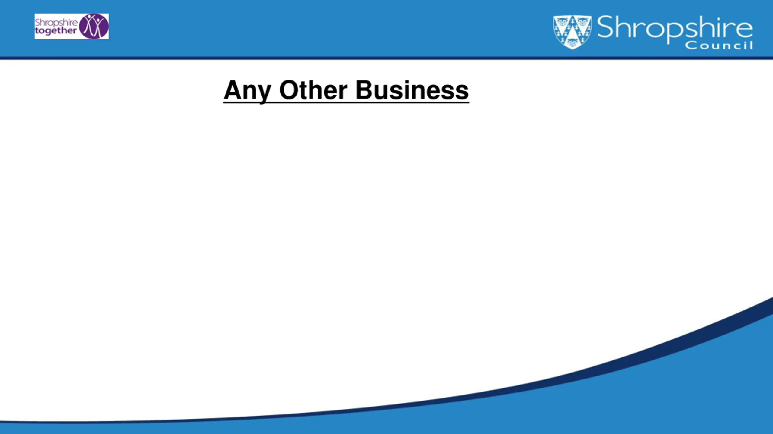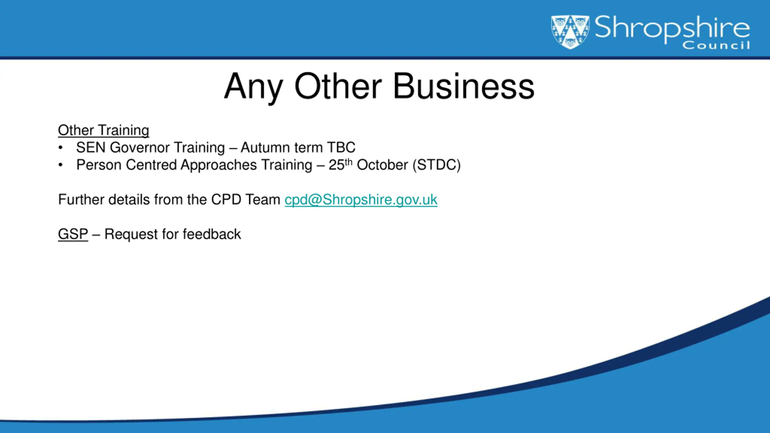 Any Other Business Other Training SEN Governor Training Autumn term TBC Person Centred Approaches Training 25th October (STDC) Further details from the CPD Team cpd@Shropshire.gov.uk GSP Request for feedback