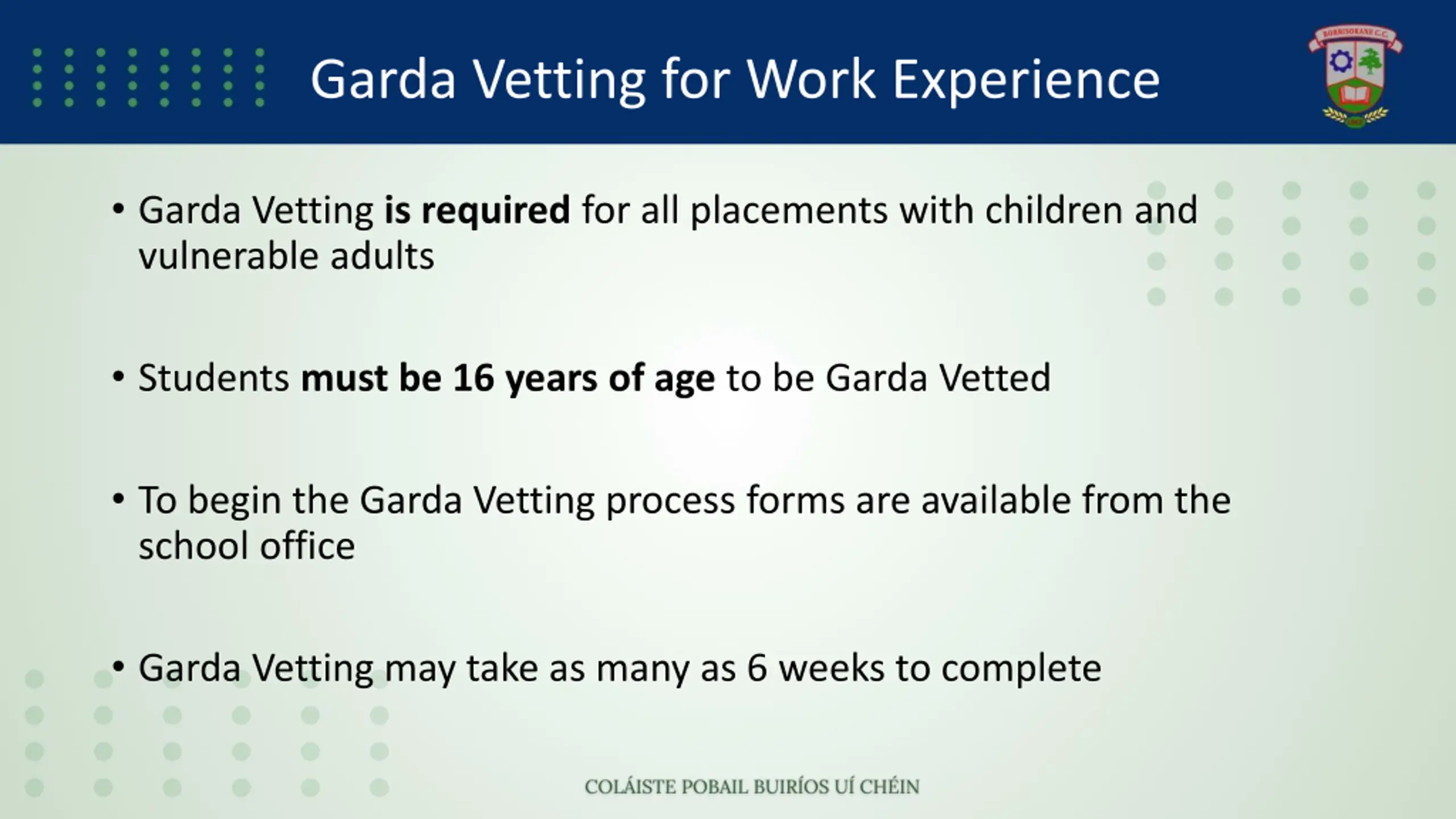 Garda Vetting for Work Experience Garda Vetting is required for all placements with children and vulnerable adults Students must be 16 years of age to be Garda Vetted To begin the Garda Vetting process forms are available from the school office Garda Vetting may take as many as 6 weeks to complete