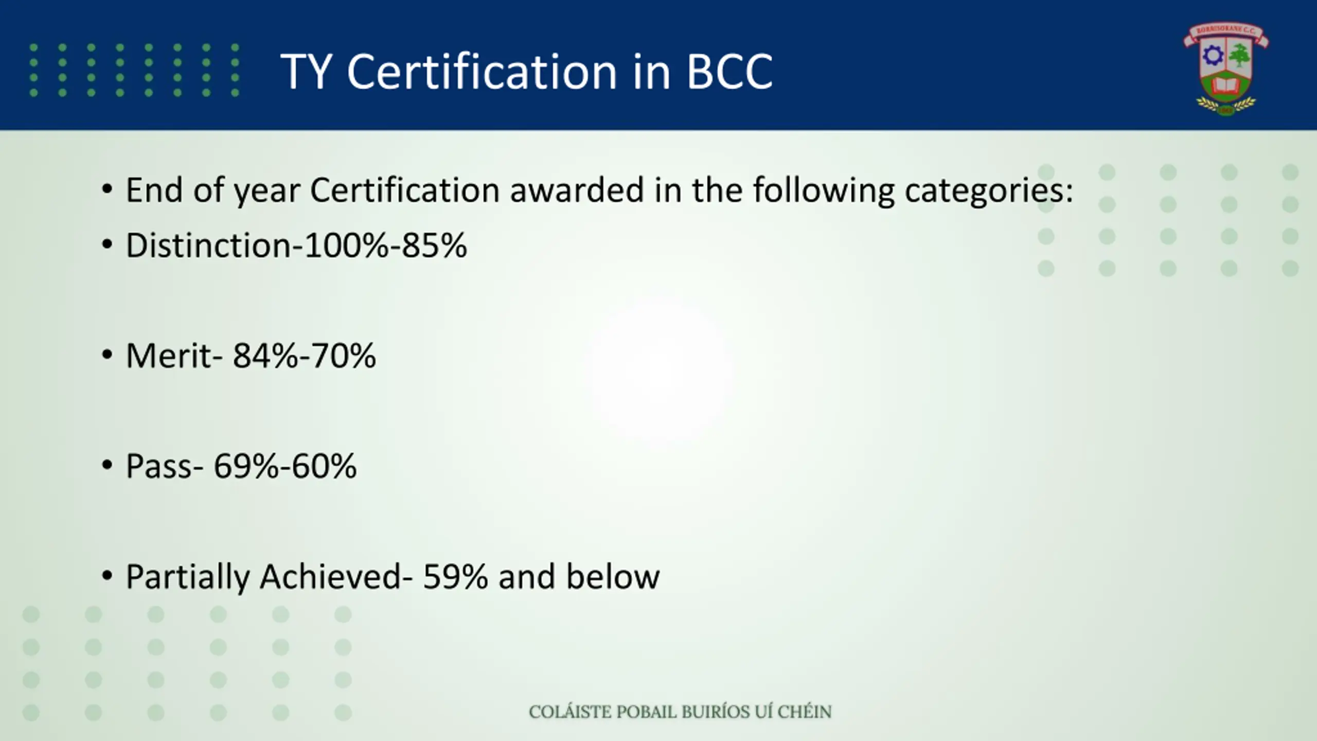 TY Certification in BCC End of year Certification awarded in the following categories: Distinction-100%-85% Merit- 84%-70% Pass- 69%-60% Partially Achieved- 59% and below