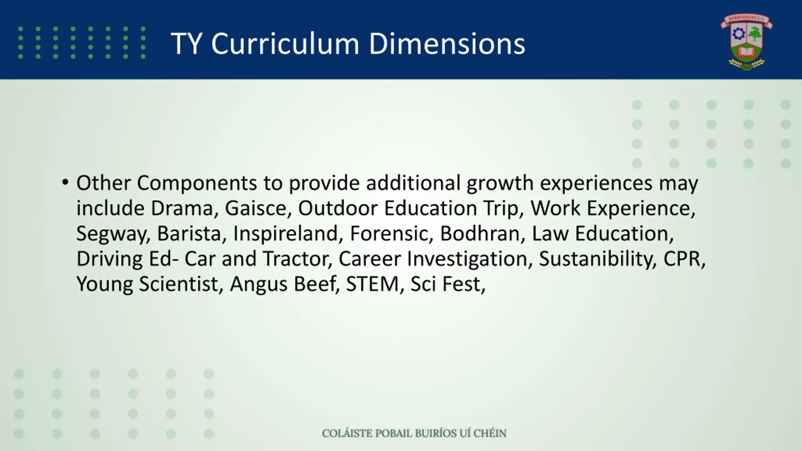 TY Curriculum Dimensions Other Components to provide additional growth experiences may include Drama, Gaisce, Outdoor Education Trip, Work Experience, Segway, Barista, Inspireland, Forensic, Bodhran, Law Education, Driving Ed- Car and Tractor, Career Investigation, Sustanibility, CPR, Young Scientist, Angus Beef, STEM, Sci Fest,