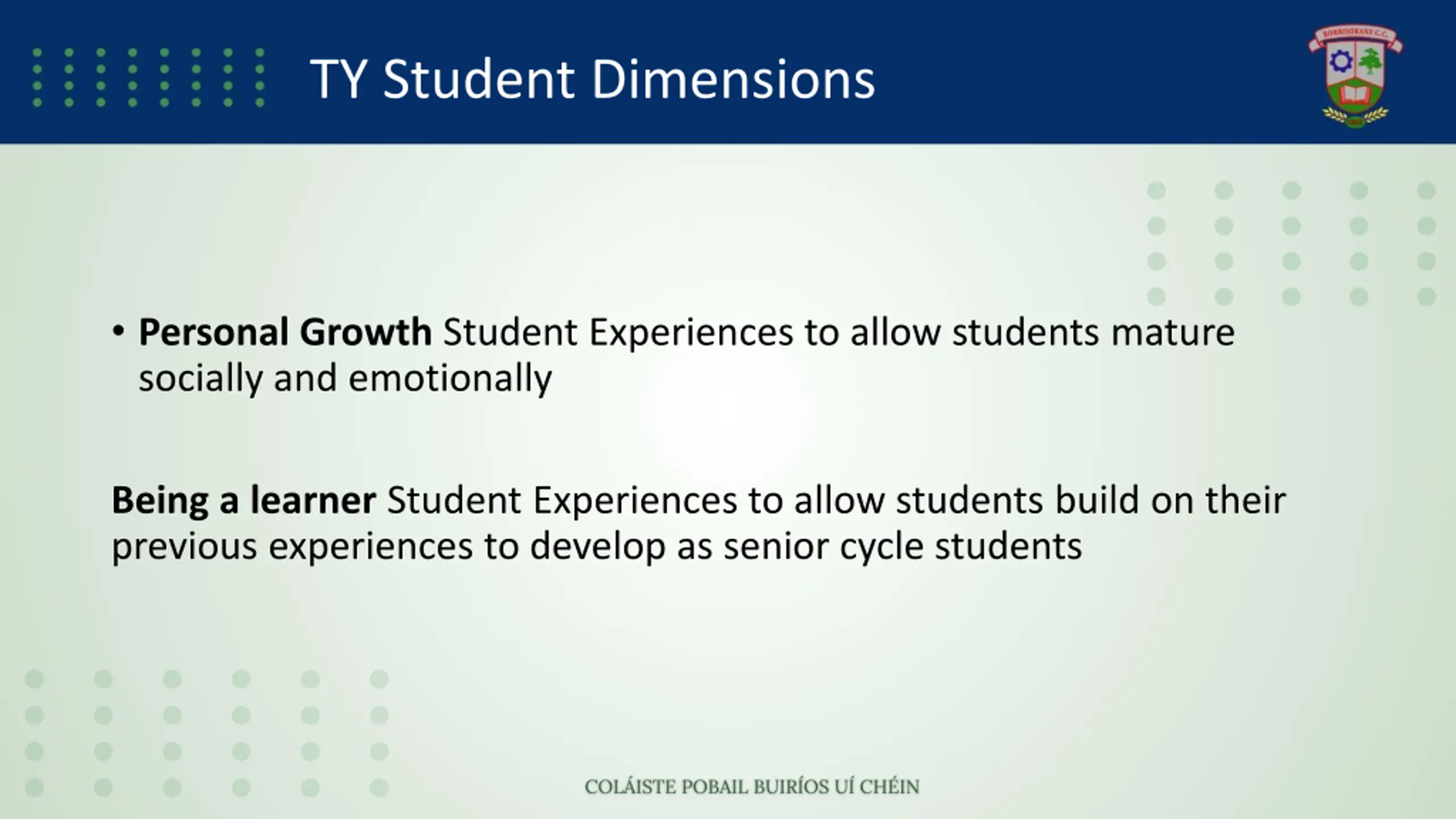 TY Student Dimensions Personal Growth Student Experiences to allow students mature socially and emotionally Being a learner Student Experiences to allow students build on their previous experiences to develop as senior cycle students