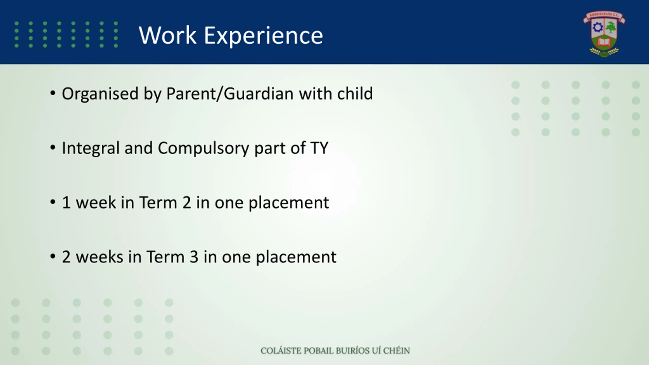 Work Experience Organised by Parent/Guardian with child Integral and Compulsory part of TY 1 week in Term 2 in one placement 2 weeks in Term 3 in one placement