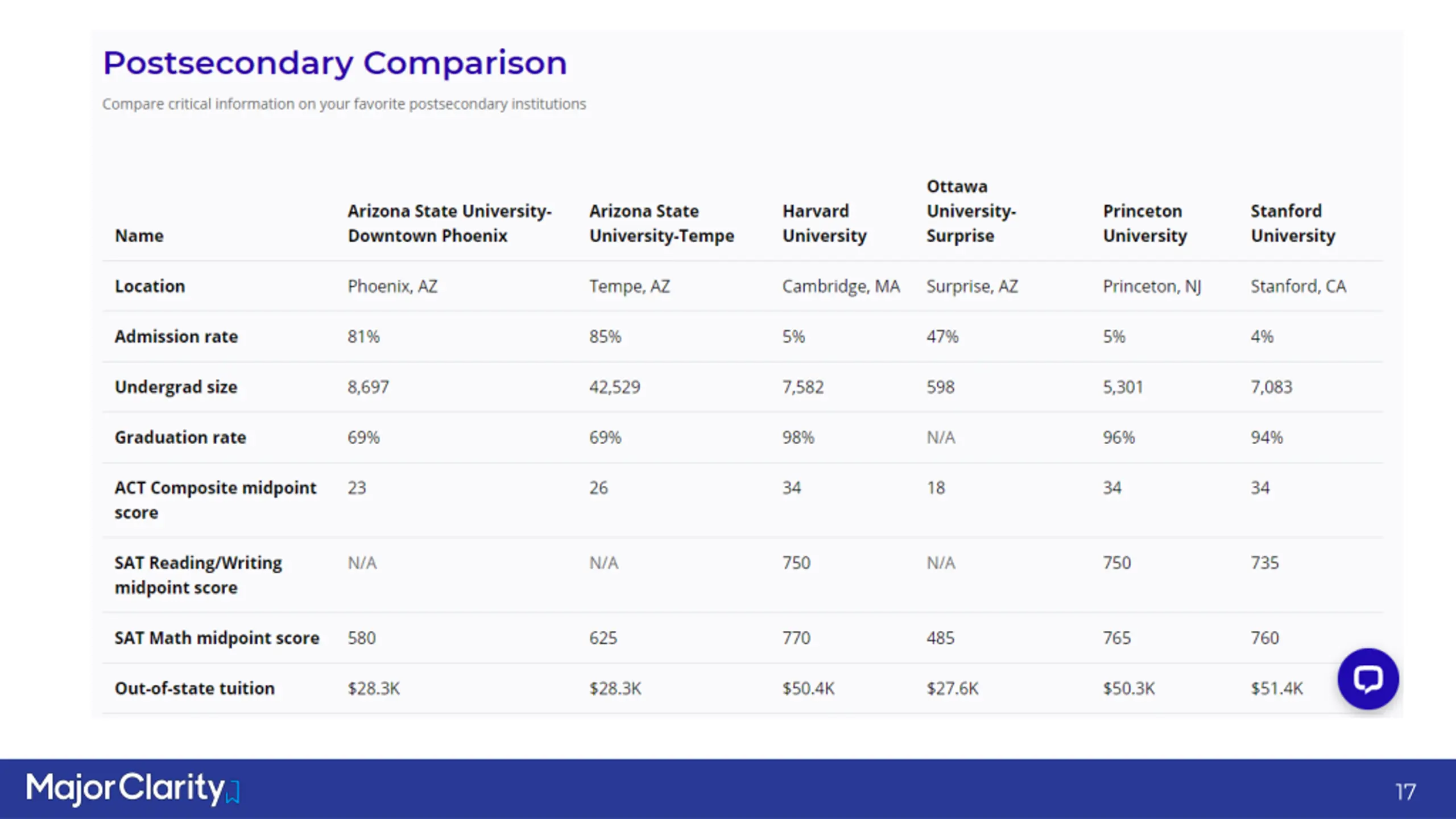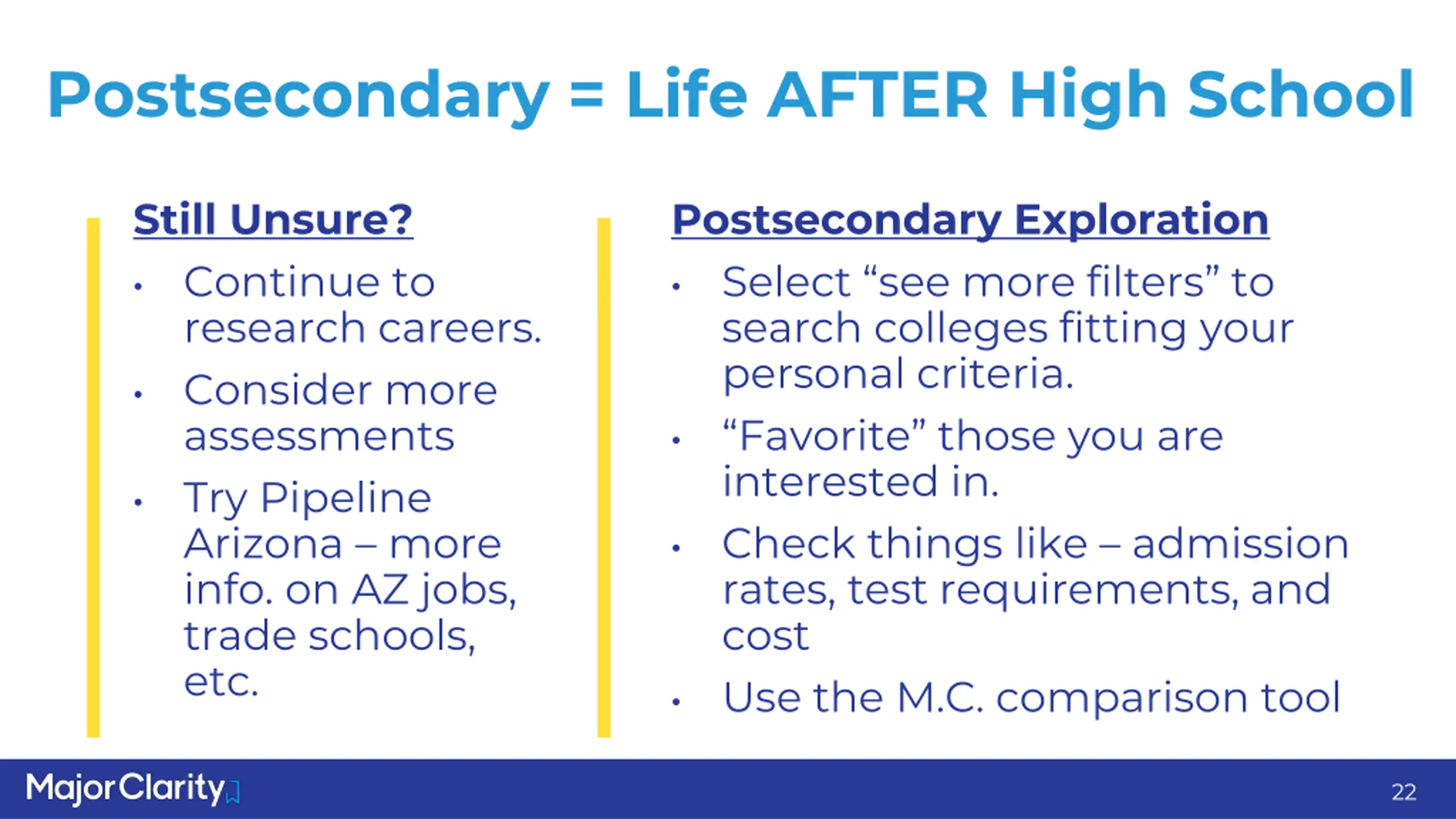 Postsecondary = Life AFTER High School Still Unsure? Continue to research careers. Consider more assessments Try Pipeline Arizona more info. on AZ jobs, trade schools, etc. Postsecondary Exploration Select see more filters to search colleges fitting your personal criteria. Favorite those you are interested in. Check things like admission rates, test requirements, and cost Use the M.C. comparison tool 22