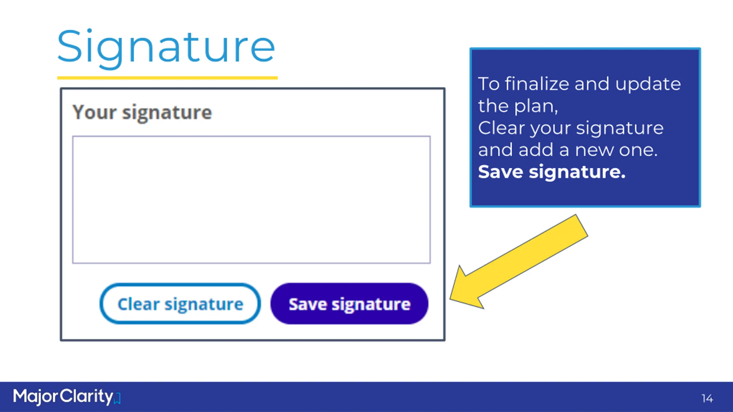 Signature To finalize and update the plan, Clear your signature and add a new one. Save signature. 14