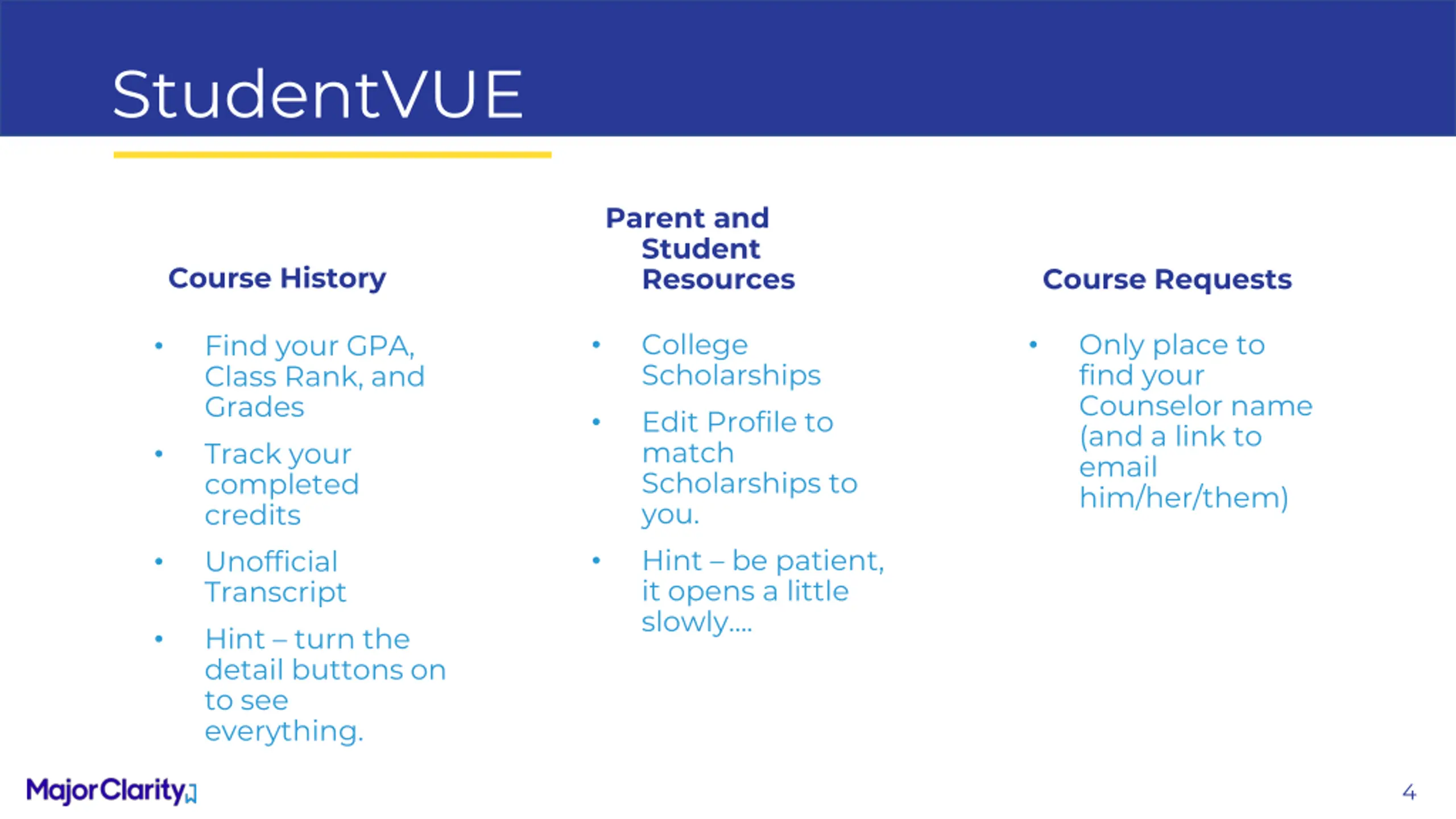 StudentVUE Parent and Student Resources Course History Course Requests College Scholarships Edit Profile to match Scholarships to you. Hint be patient, it opens a little slowly . Only place to find your Counselor name (and a link to email him/her/them) Find your GPA, Class Rank, and Grades Track your completed credits Unofficial Transcript Hint turn the detail buttons on to see everything. 4