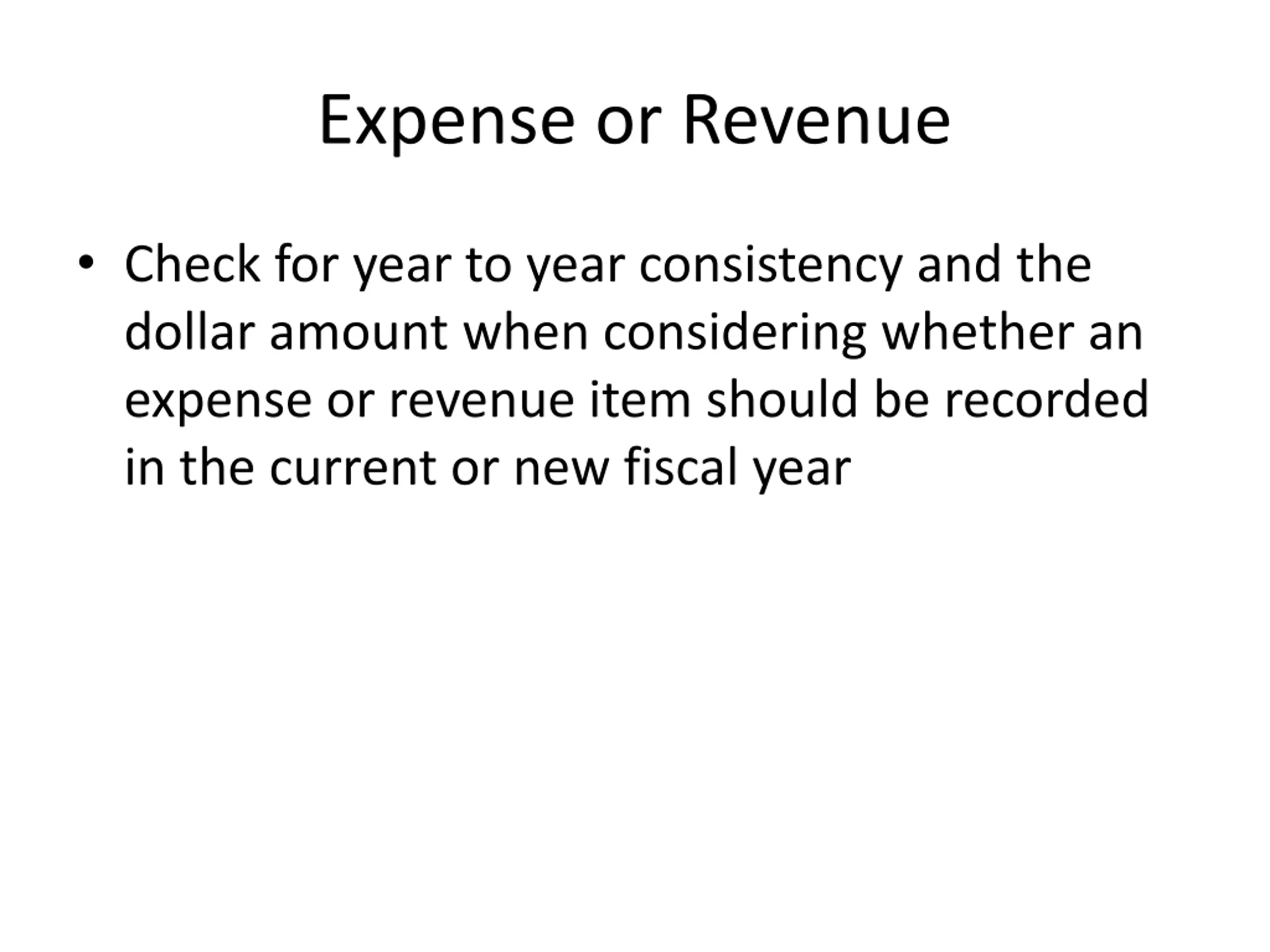 Expense or Revenue Check for year to year consistency and the dollar amount when considering whether an expense or revenue item should be recorded in the current or new fiscal year