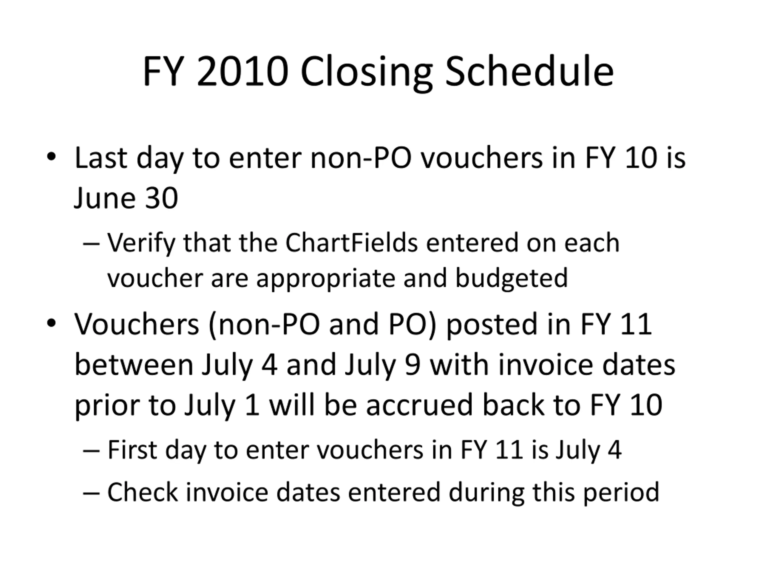 FY 2010 Closing Schedule Last day to enter non-PO vouchers in FY 10 is June 30 Verify that the ChartFields entered on each voucher are appropriate and budgeted Vouchers (non-PO and PO) posted in FY 11 between July 4 and July 9 with invoice dates prior to July 1 will be accrued back to FY 10 First day to enter vouchers in FY 11 is July 4 Check invoice dates entered during this period