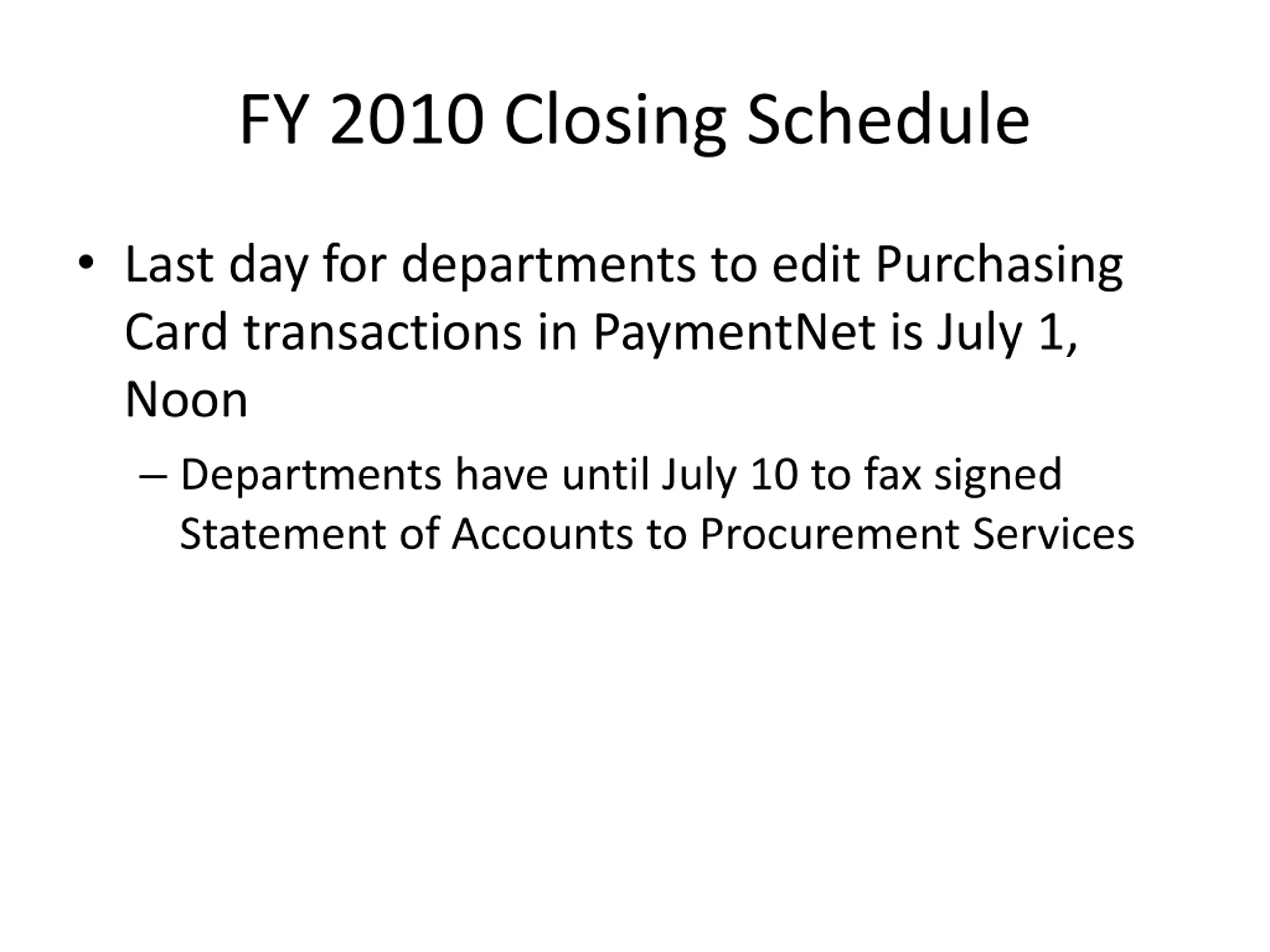 FY 2010 Closing Schedule Last day for departments to edit Purchasing Card transactions in PaymentNet is July 1, Noon Departments have until July 10 to fax signed Statement of Accounts to Procurement Services