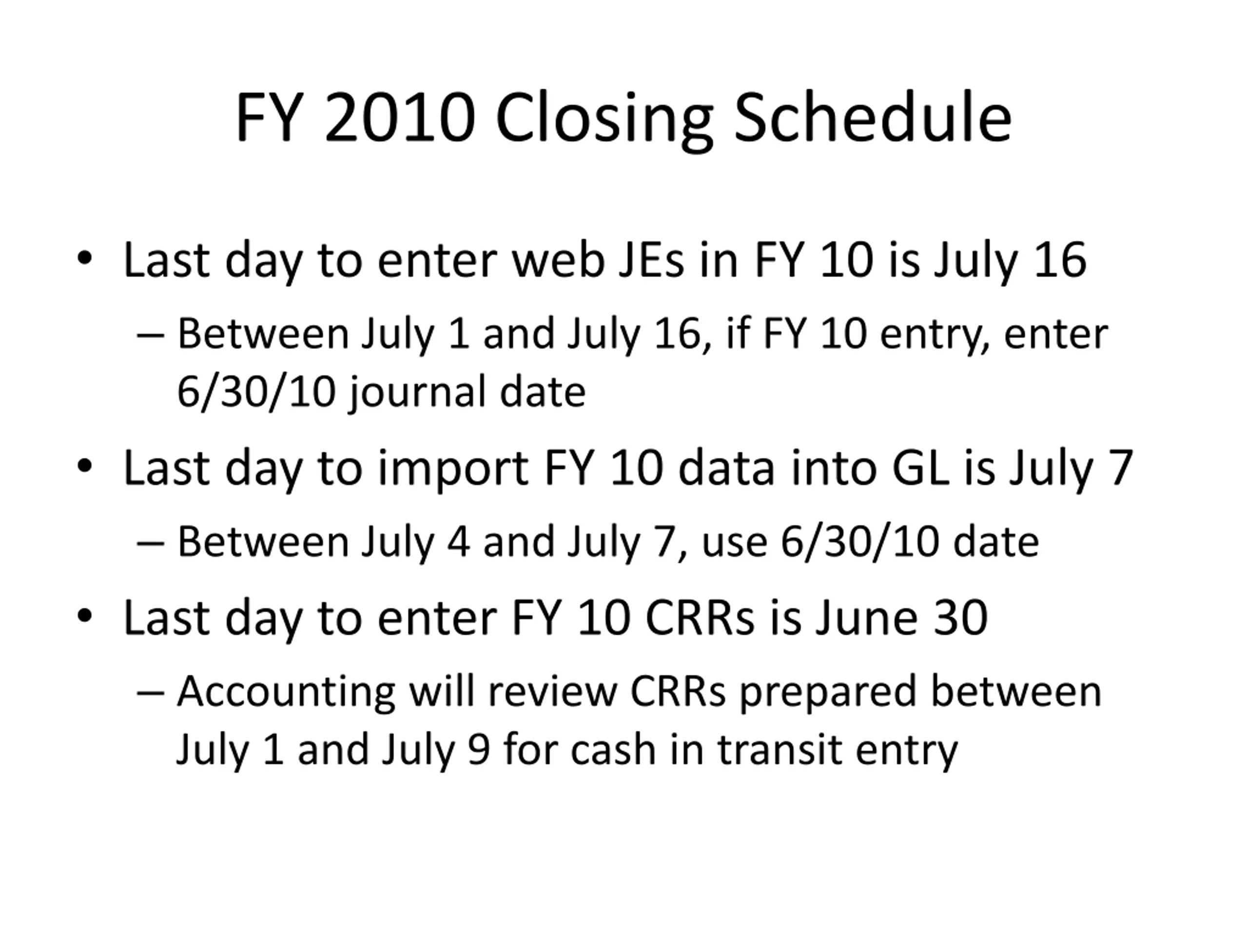 FY 2010 Closing Schedule Last day to enter web JEs in FY 10 is July 16 Between July 1 and July 16, if FY 10 entry, enter 6/30/10 journal date Last day to import FY 10 data into GL is July 7 Between July 4 and July 7, use 6/30/10 date Last day to enter FY 10 CRRs is June 30 Accounting will review CRRs prepared between July 1 and July 9 for cash in transit entry