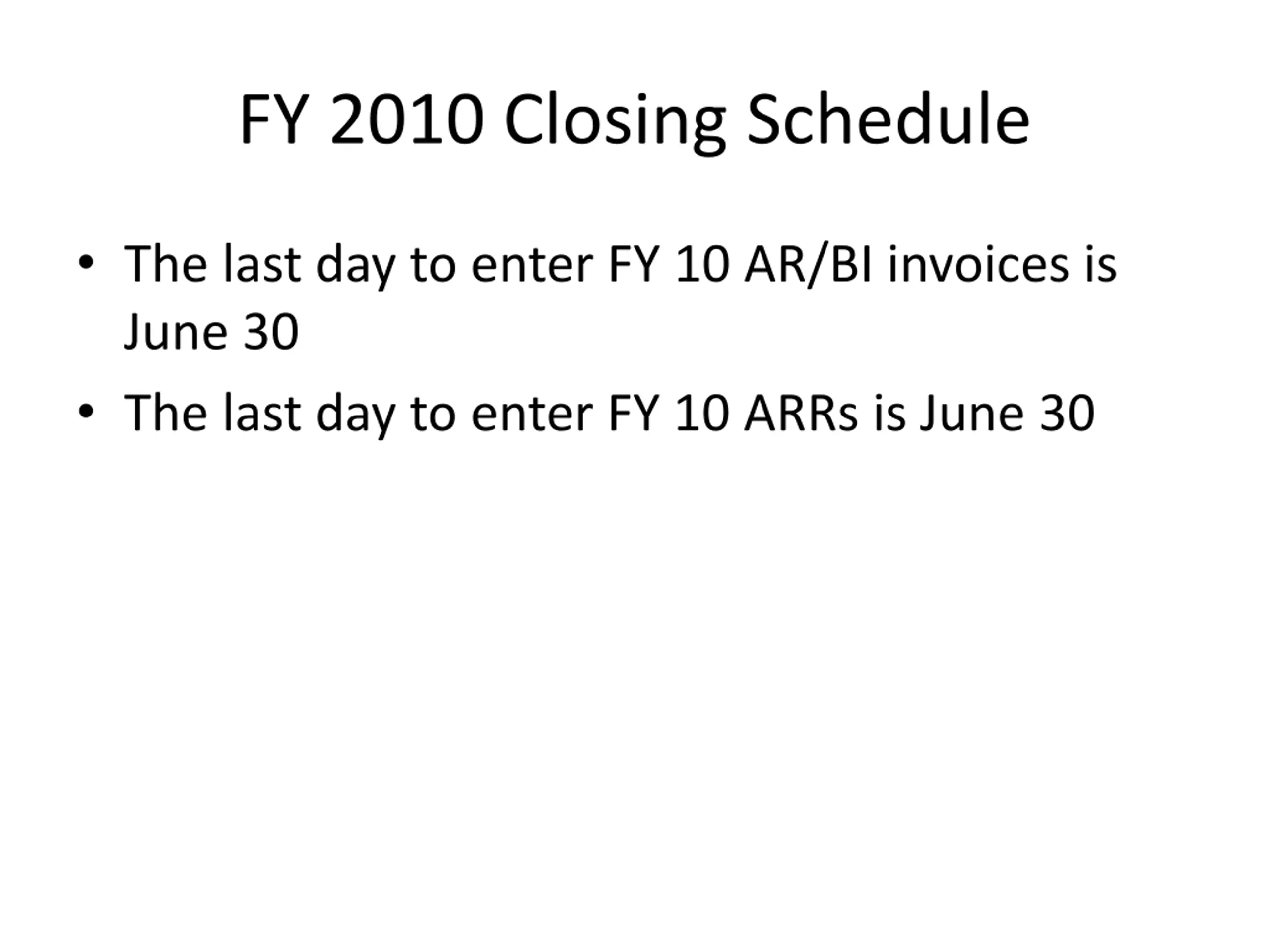 FY 2010 Closing Schedule The last day to enter FY 10 AR/BI invoices is June 30 The last day to enter FY 10 ARRs is June 30