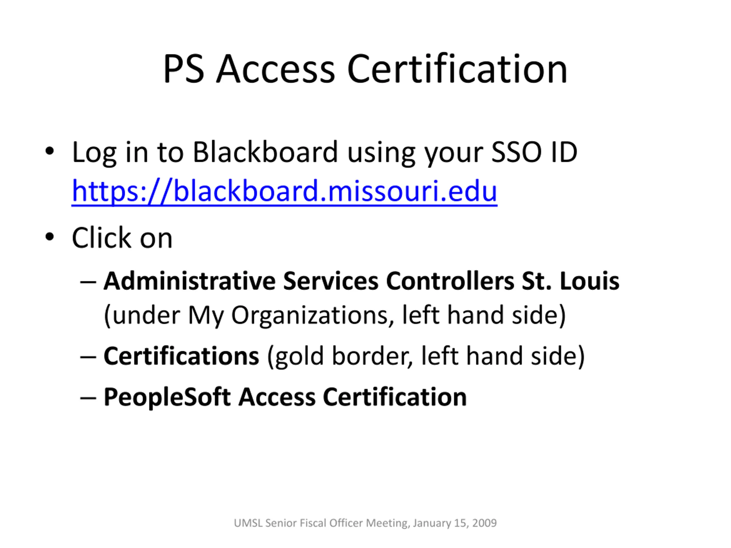 PS Access Certification Log in to Blackboard using your SSO ID https://blackboard.missouri.edu Click on Administrative Services Controllers St. Louis (under My Organizations, left hand side) Certifications (gold border, left hand side) PeopleSoft Access Certification UMSL Senior Fiscal Officer Meeting, January 15, 2009
